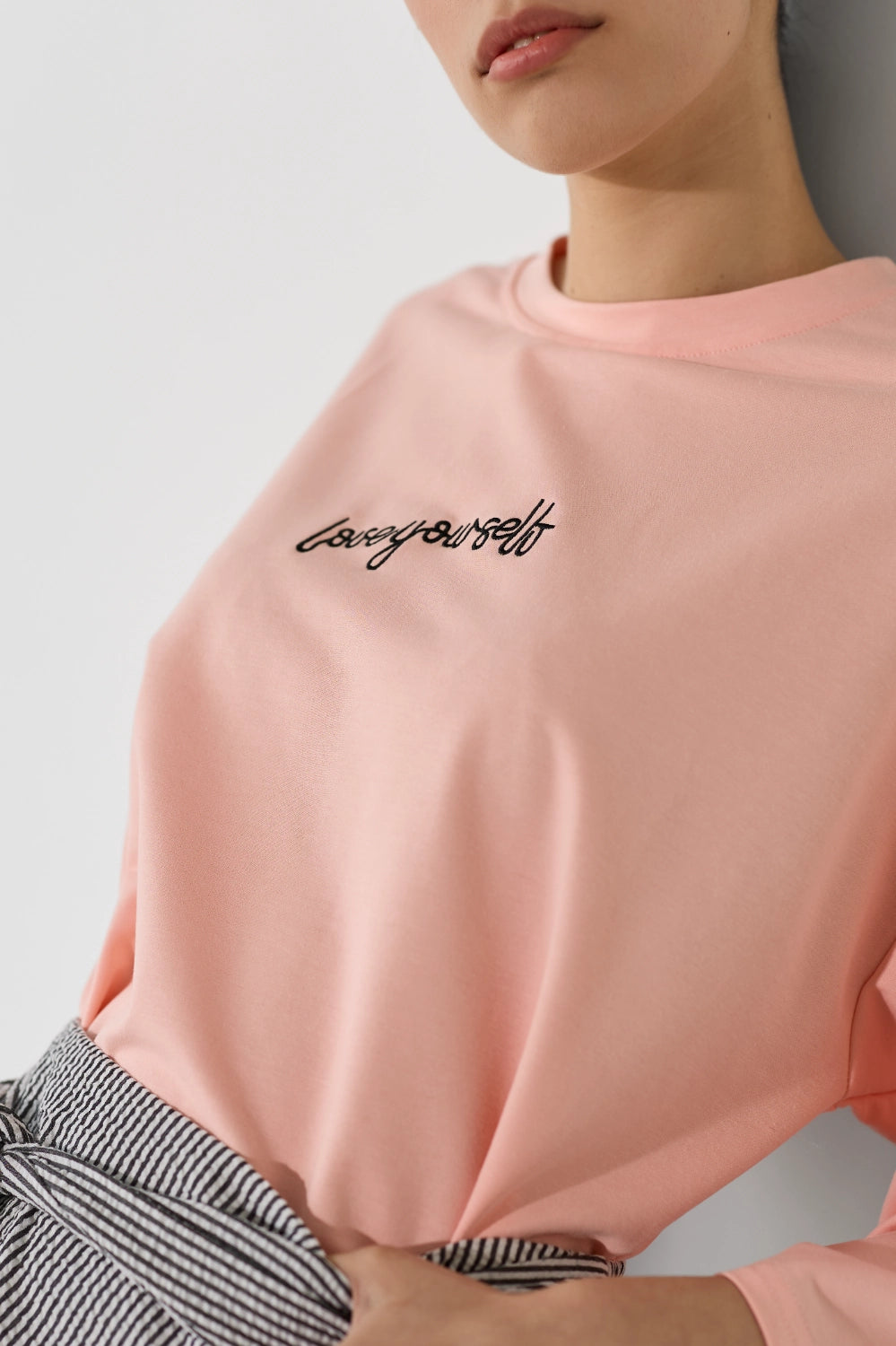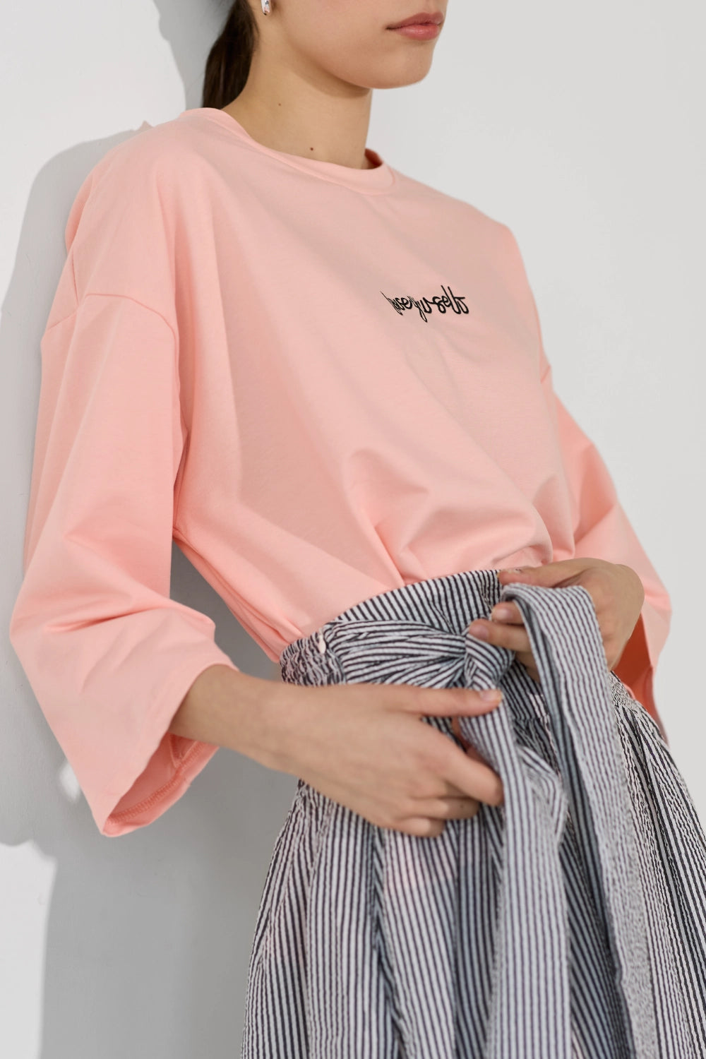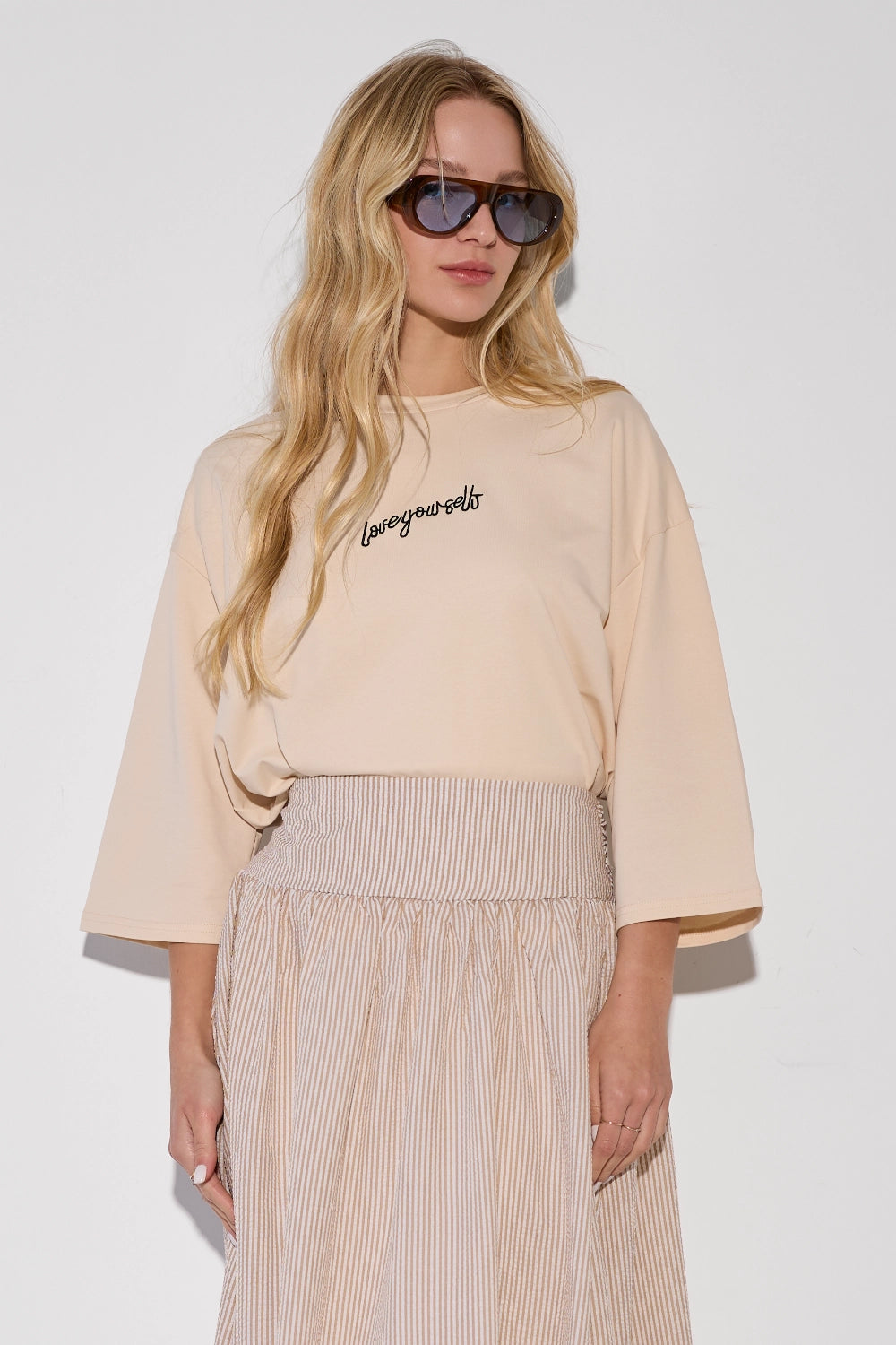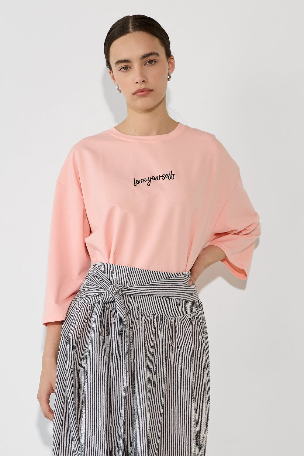 חולצה אוברסייז עם דפוס לב מיוחד, שמוסיף נגיעה שובבה ורומנטית לגזרה משוחררת ונוחה. בד קליל ונושם שמרגיש נוח לאורך כל היום – פריט שמשלב כיף וסטייל בצורה מושלמת. לבשי אותה עם ג'ינס לסטייל קז'ואל יומיומי, מכונסת לתוך חצאית מידי לאאוטפיט מוקפד, או עם מכנסי טרנינג לוק נוח ומחמיא.