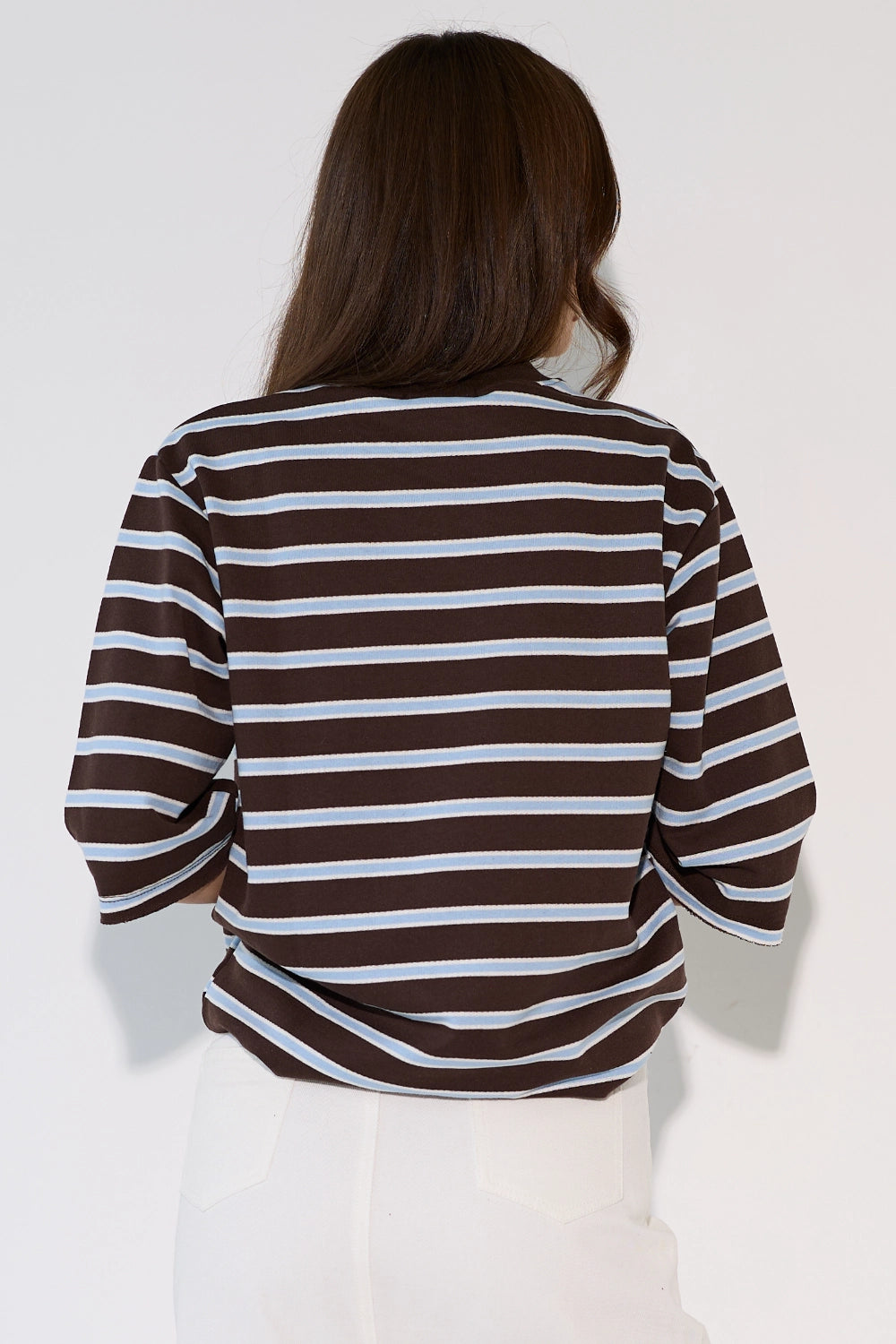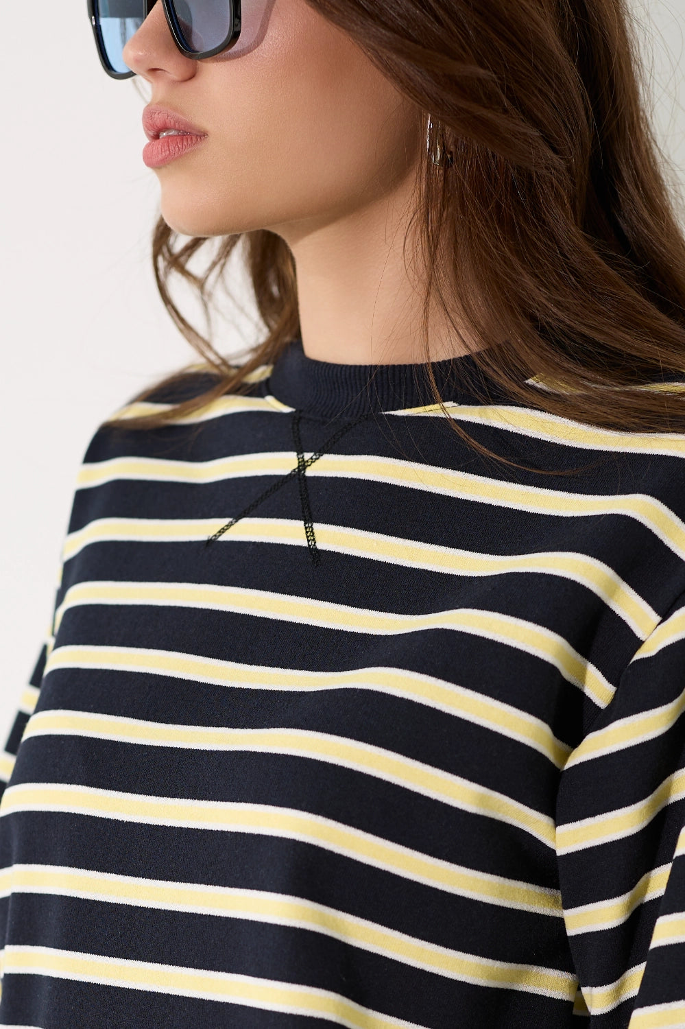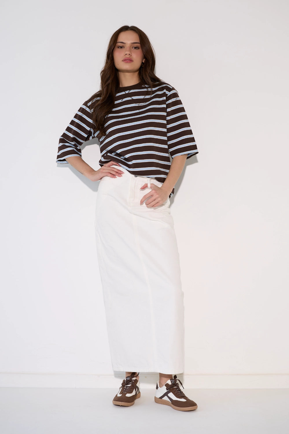 חולצת אוברסייז בגזרה נינוחה ורחבה עם פסים קלאסיים שמעניקים מראה טרנדי ונקי. החולצה עשויה בטכניקת פלאט לוק איכותית לגימור מעודן ומקצועי, שמבטיח תפרים שטוחים ומראה מושלם.
