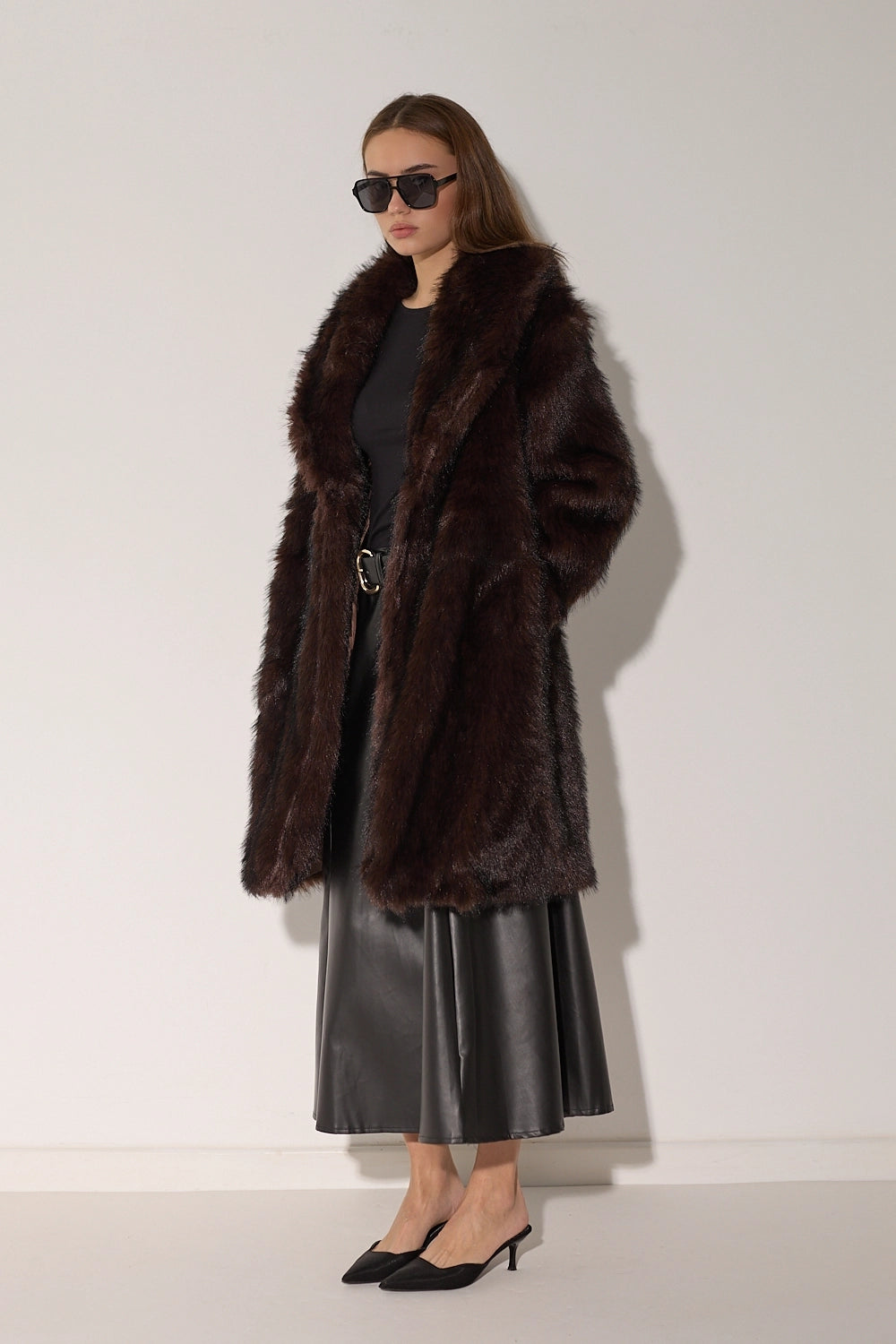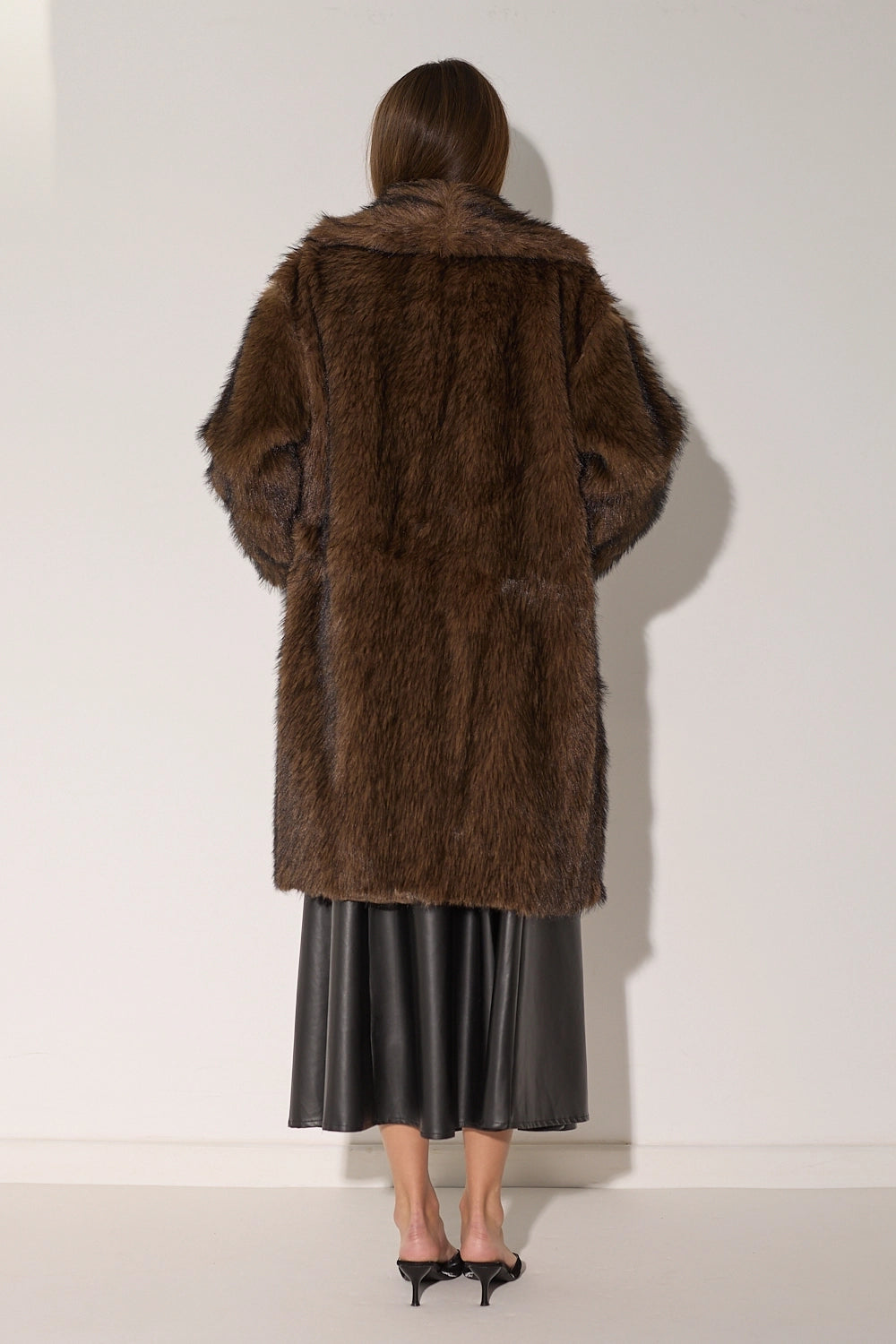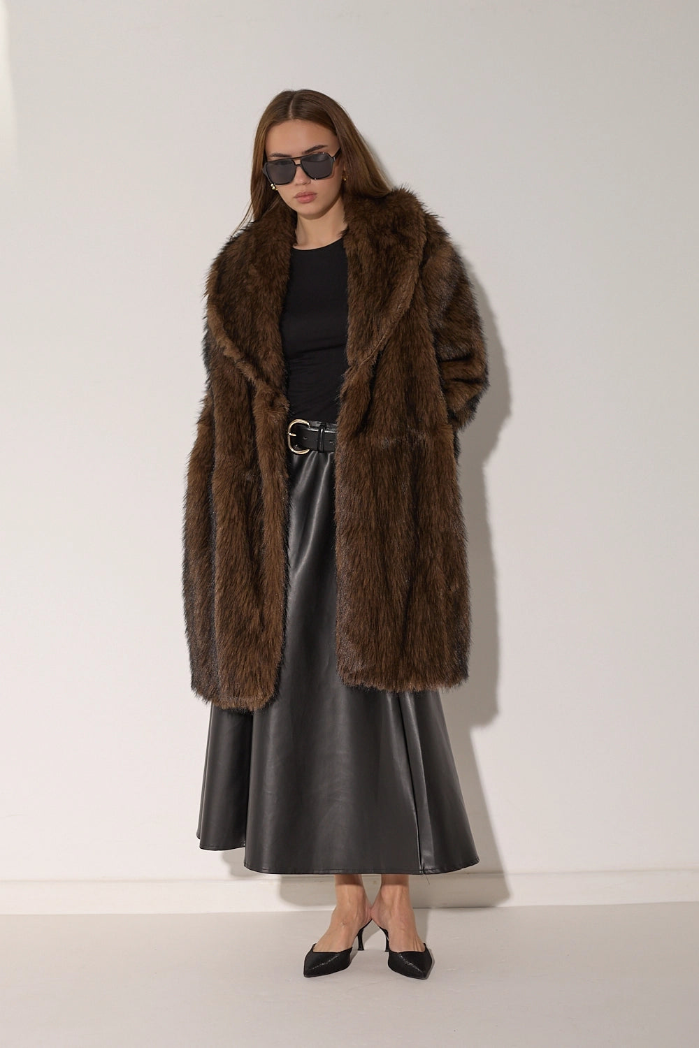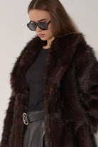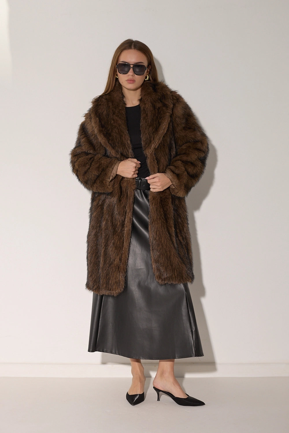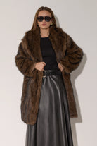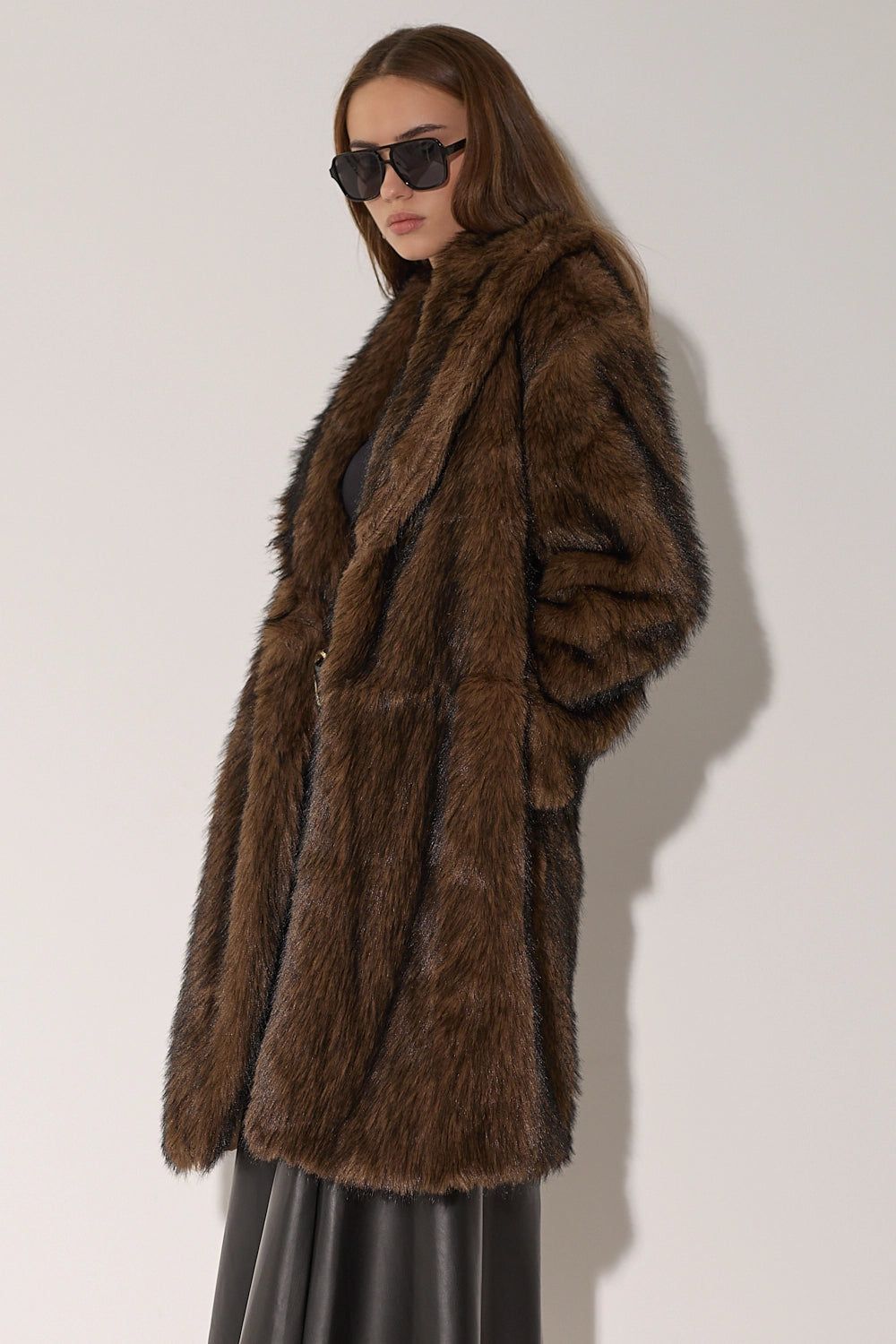 מעיל פרווה ארוך ומפואר בגווני חום-שחור עשירים ומרהיבים. עשוי מפרווה מלאכותית איכותית עם מרקם עשיר ונעים, צווארון גבוה מחמם בגזרה ארוכה שמעניקה כיסוי מלא ונוחות מקסימלית. המעיל משדר אלגנטיות ויוקרה, ומושלם לימי חורף קרים.