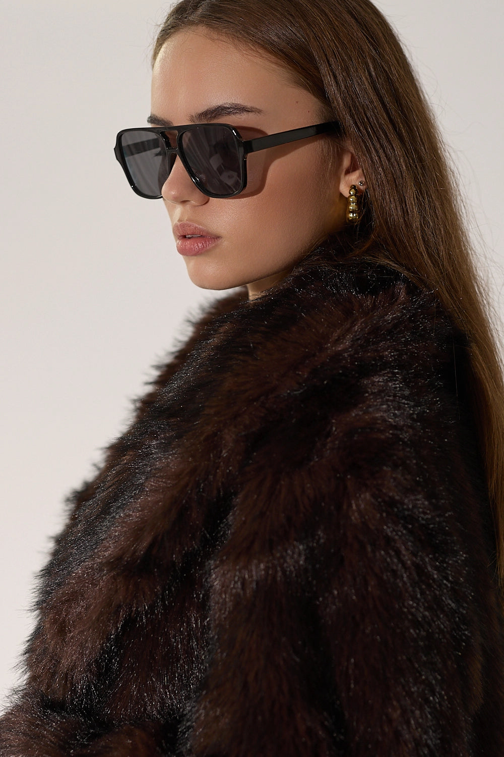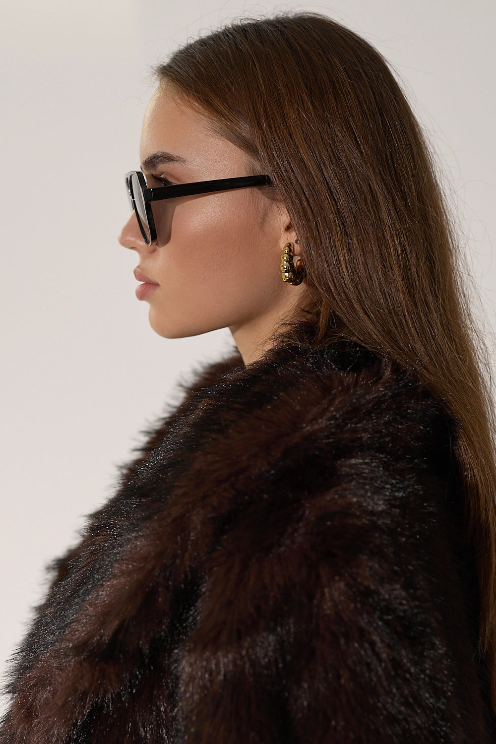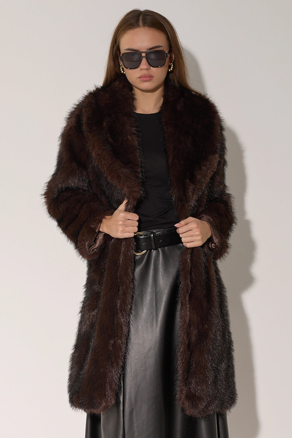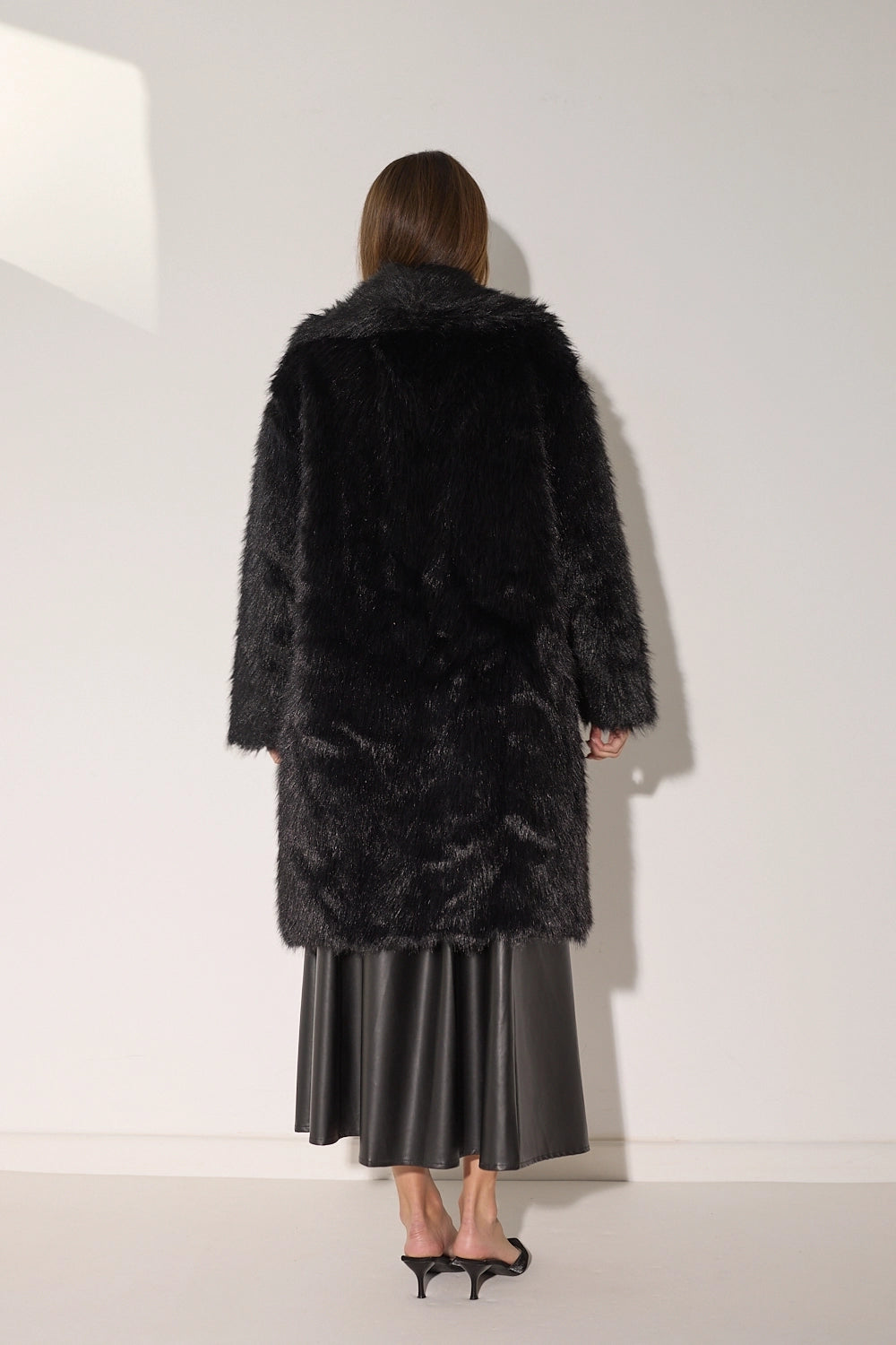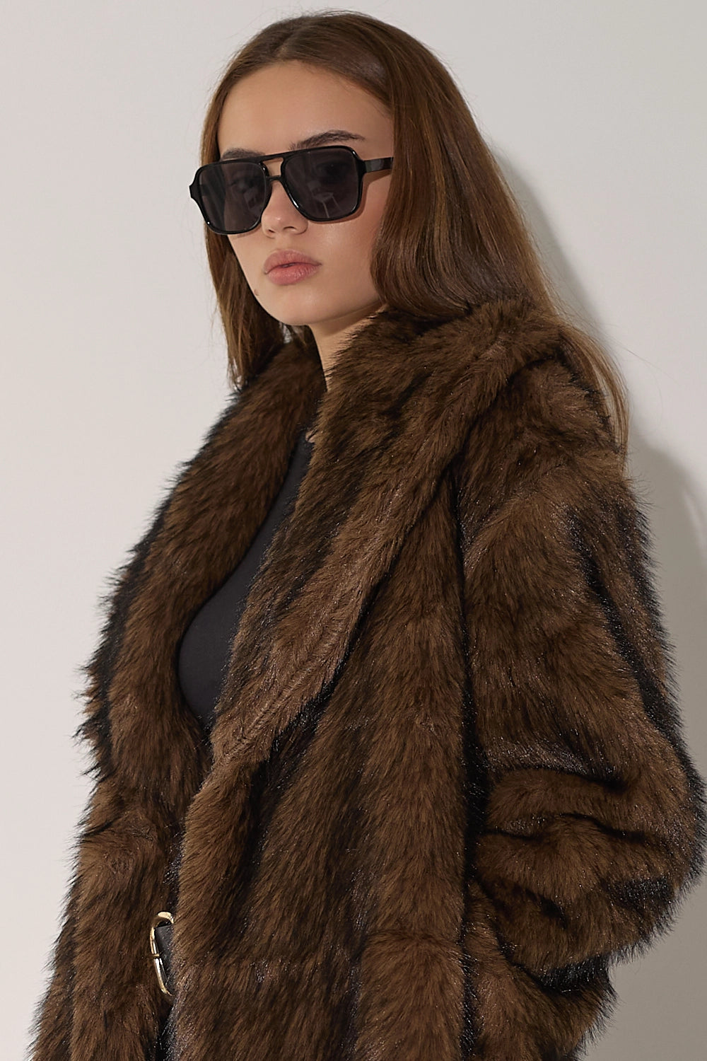 מעיל פרווה ארוך ומפואר בגווני חום-שחור עשירים ומרהיבים. עשוי מפרווה מלאכותית איכותית עם מרקם עשיר ונעים, צווארון גבוה מחמם בגזרה ארוכה שמעניקה כיסוי מלא ונוחות מקסימלית. המעיל משדר אלגנטיות ויוקרה, ומושלם לימי חורף קרים.