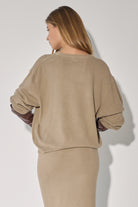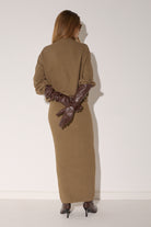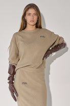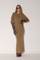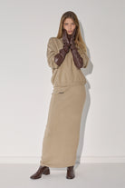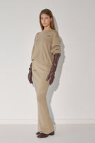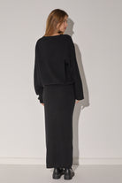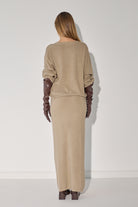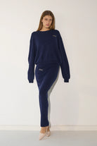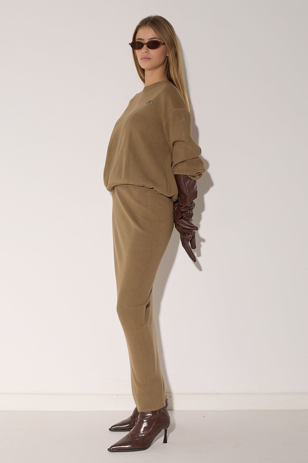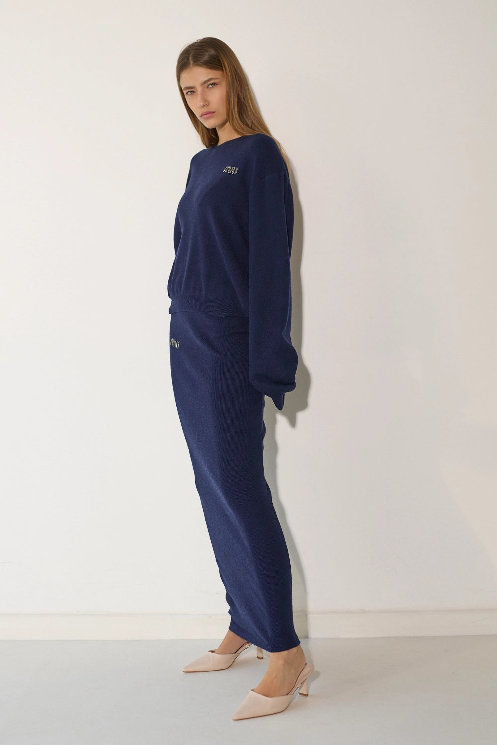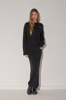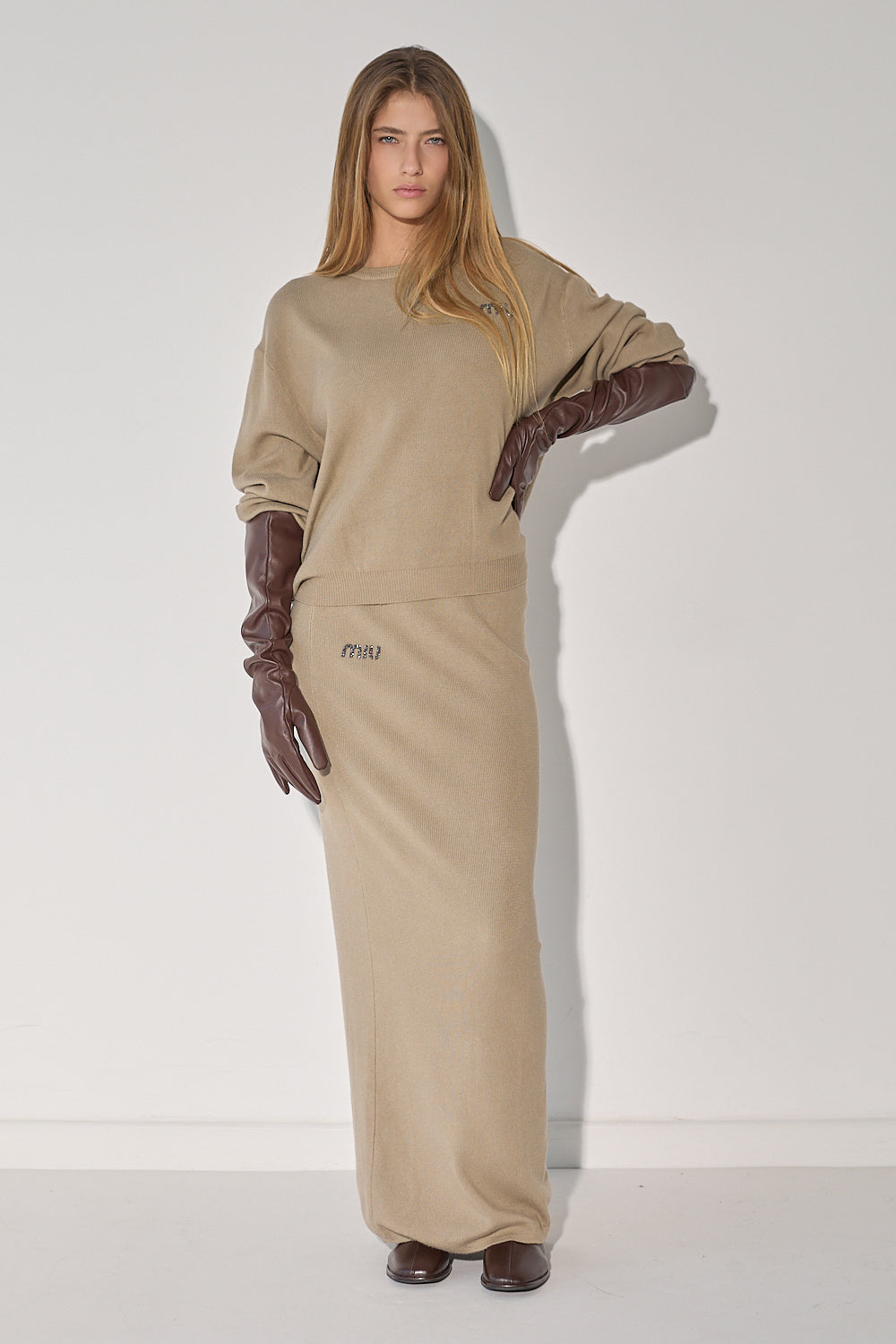 חליפת סריג השילוב המושלם של נוחות ואלגנטיות מינימליסטית. הסט כולל סוודר אוברסייז וחצאית מקסי תואמת עם עיטור משובץ, עשויים מבד סריג פרמיום ורך במיוחד.