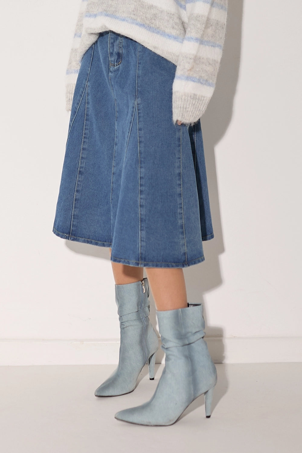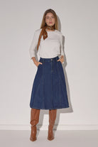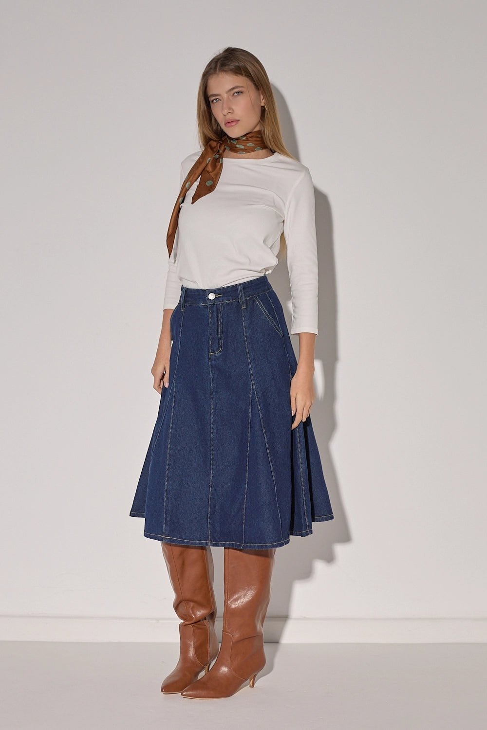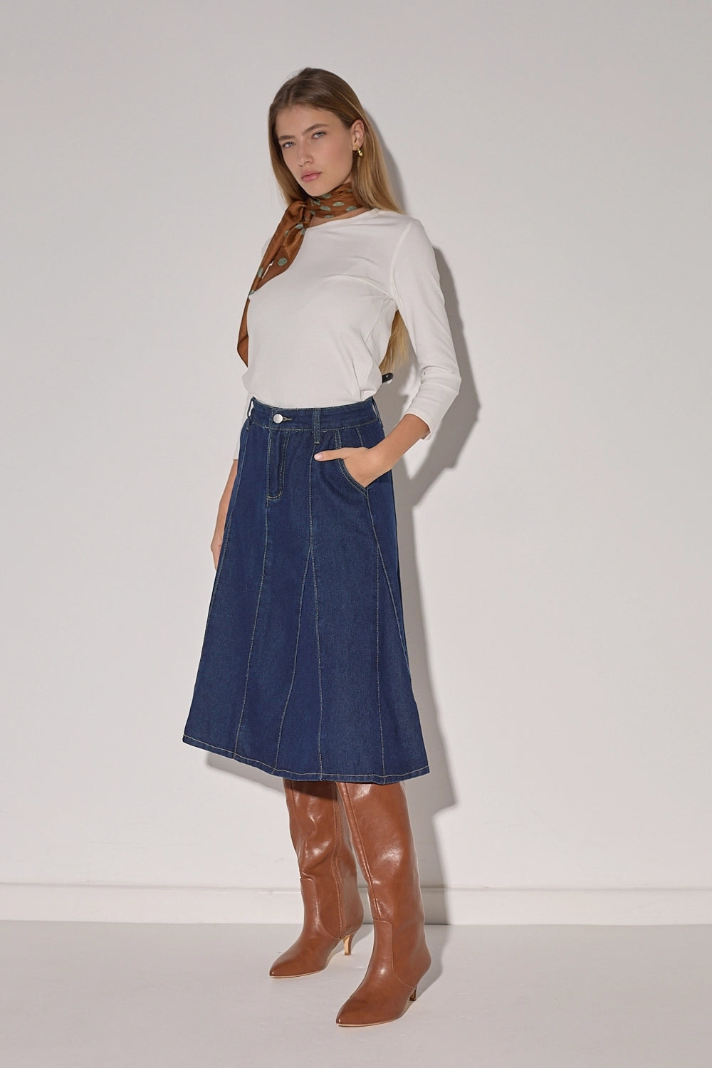 חצאית מידי אלגנטית בגזרת A-line חצאית ג'ינס תמרה – פריט קלאסי ונצחי שמשדרג כל מלתחה מחמיאה, עשויה מבד ג'ינס עם תפרים מודגשים בגוון בהיר מעניקים לה אופי ייחודי ומעט וינטג'י, בעוד הגזרה הרחבה מבטיחה נוחות ותנועה חופשית לאורך כל היום.