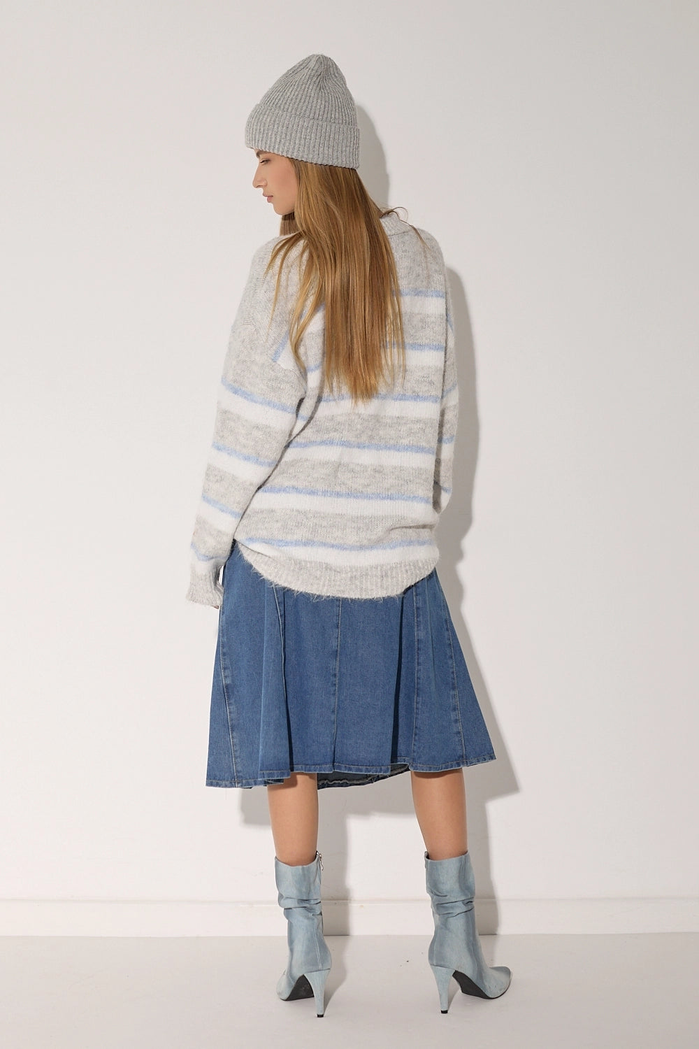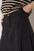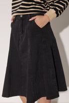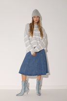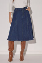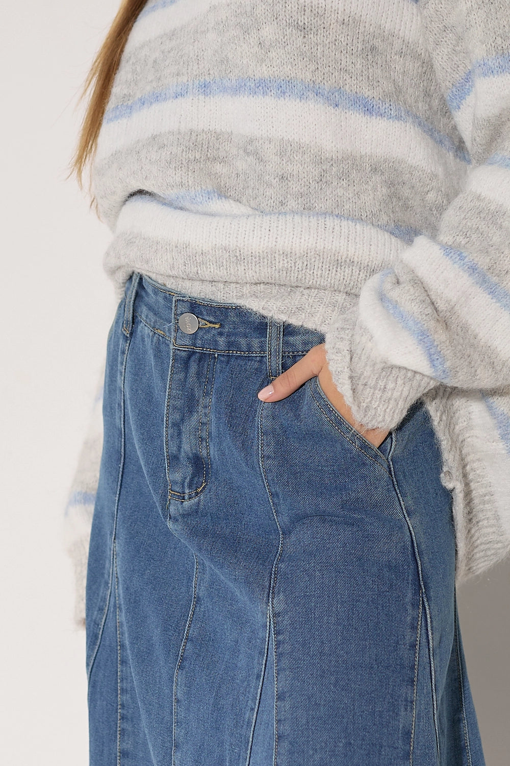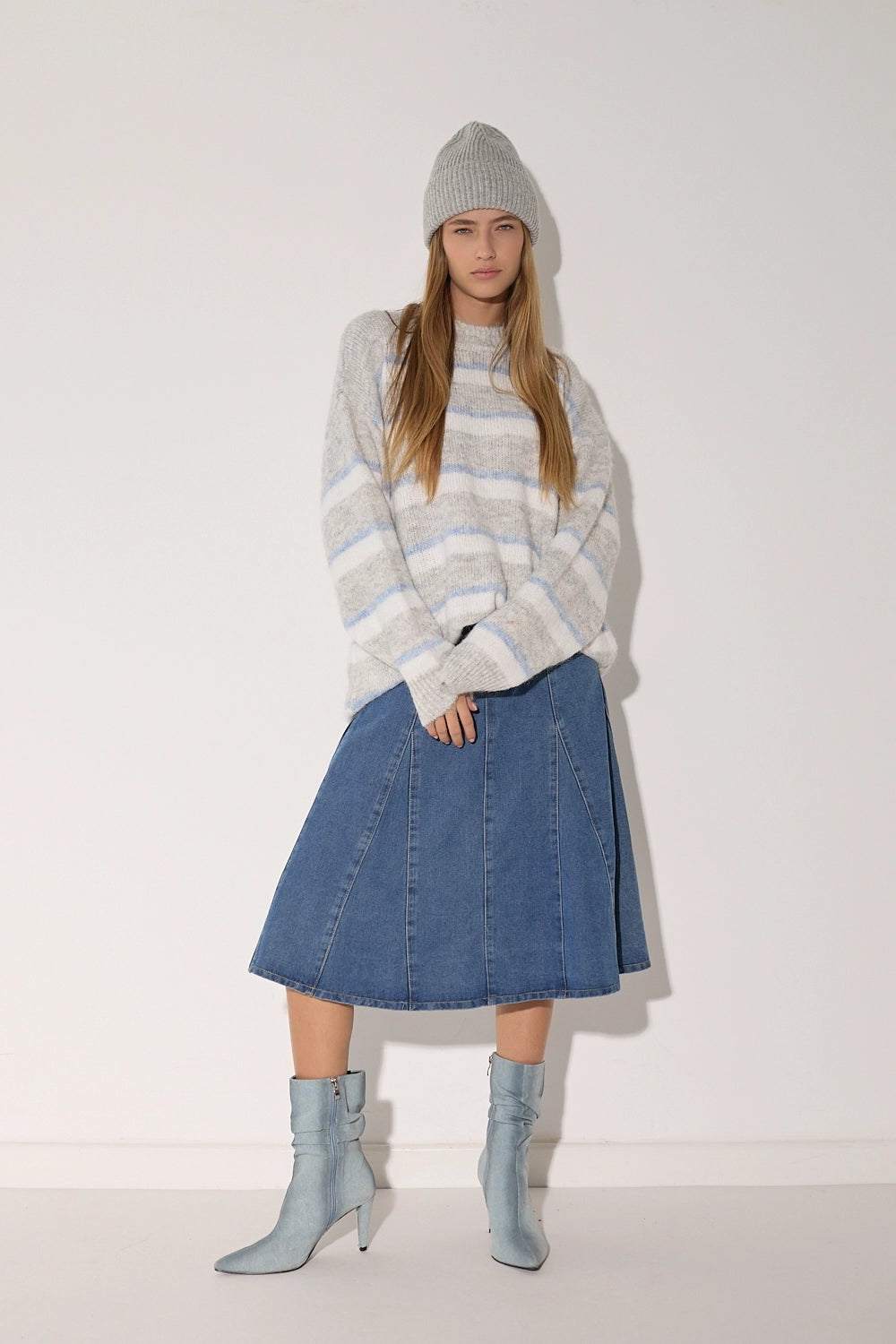 חצאית מידי אלגנטית בגזרת A-line חצאית ג'ינס תמרה – פריט קלאסי ונצחי שמשדרג כל מלתחה מחמיאה, עשויה מבד ג'ינס עם תפרים מודגשים בגוון בהיר מעניקים לה אופי ייחודי ומעט וינטג'י, בעוד הגזרה הרחבה מבטיחה נוחות ותנועה חופשית לאורך כל היום.