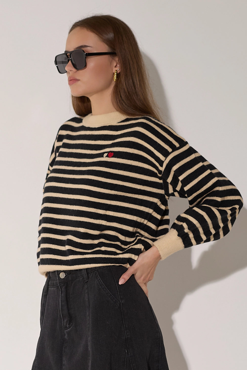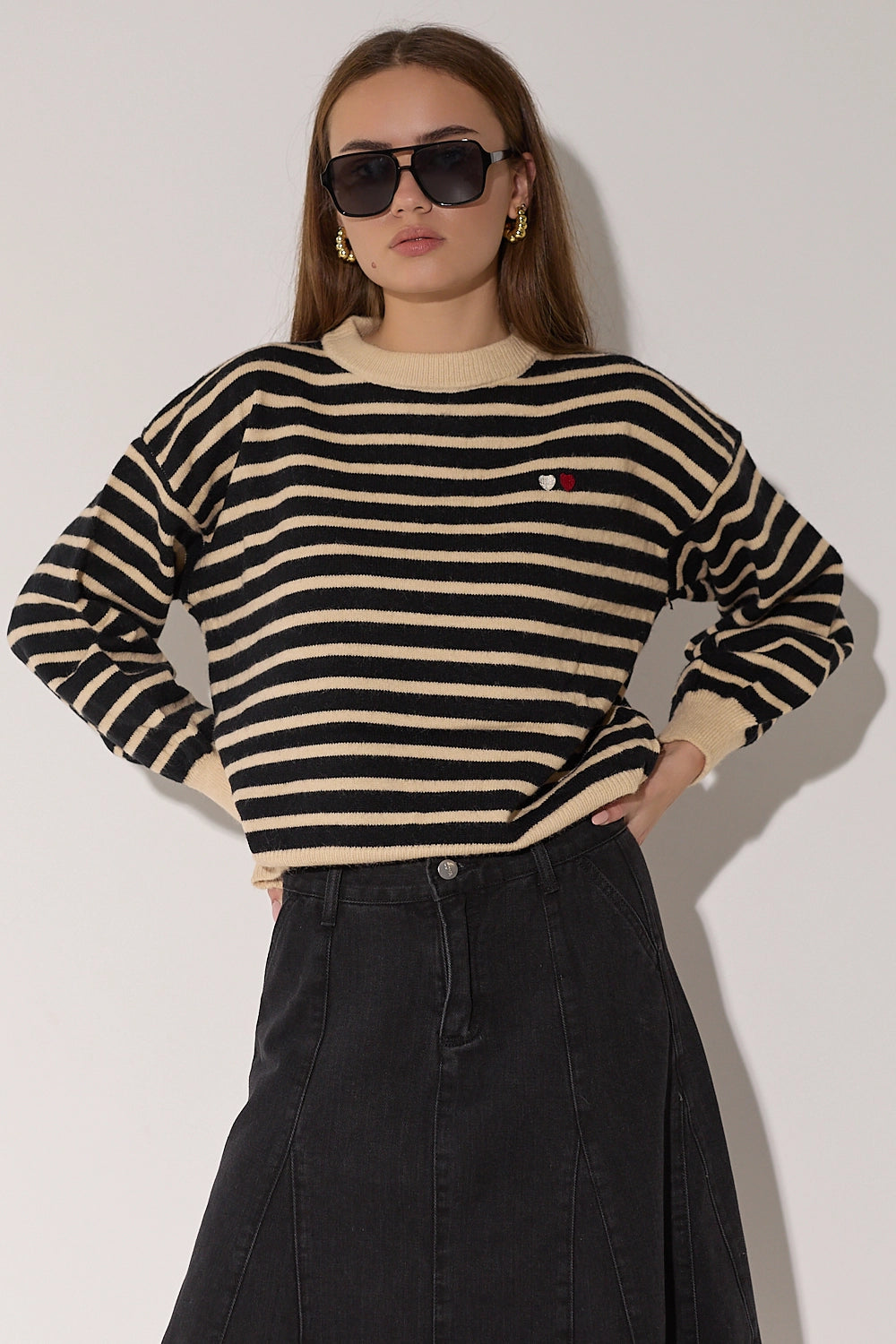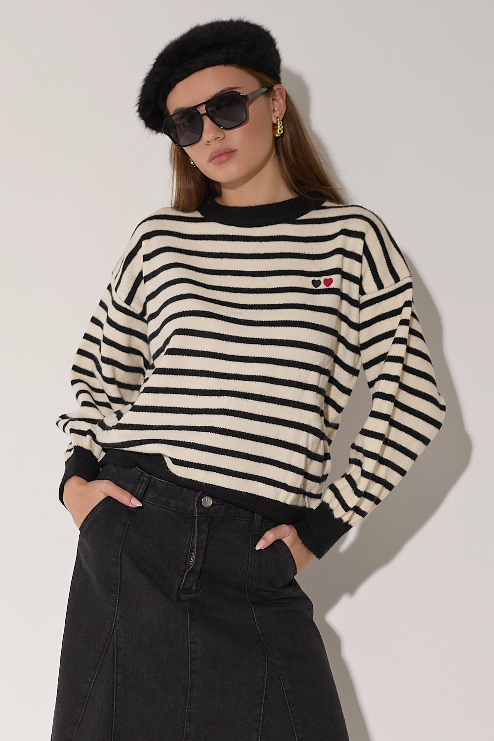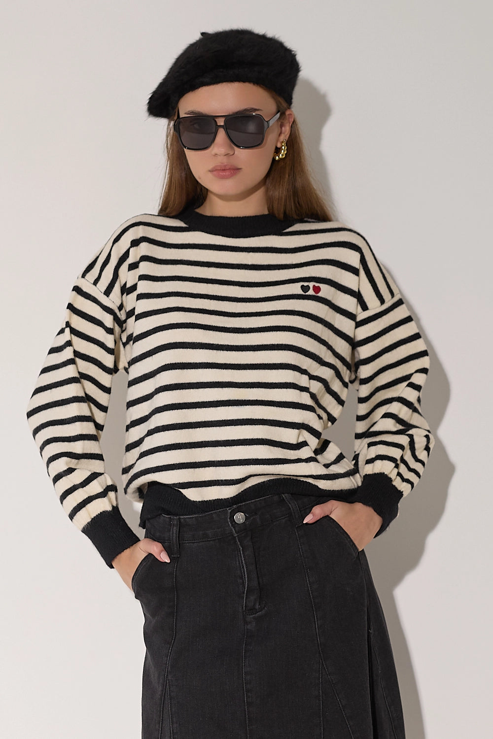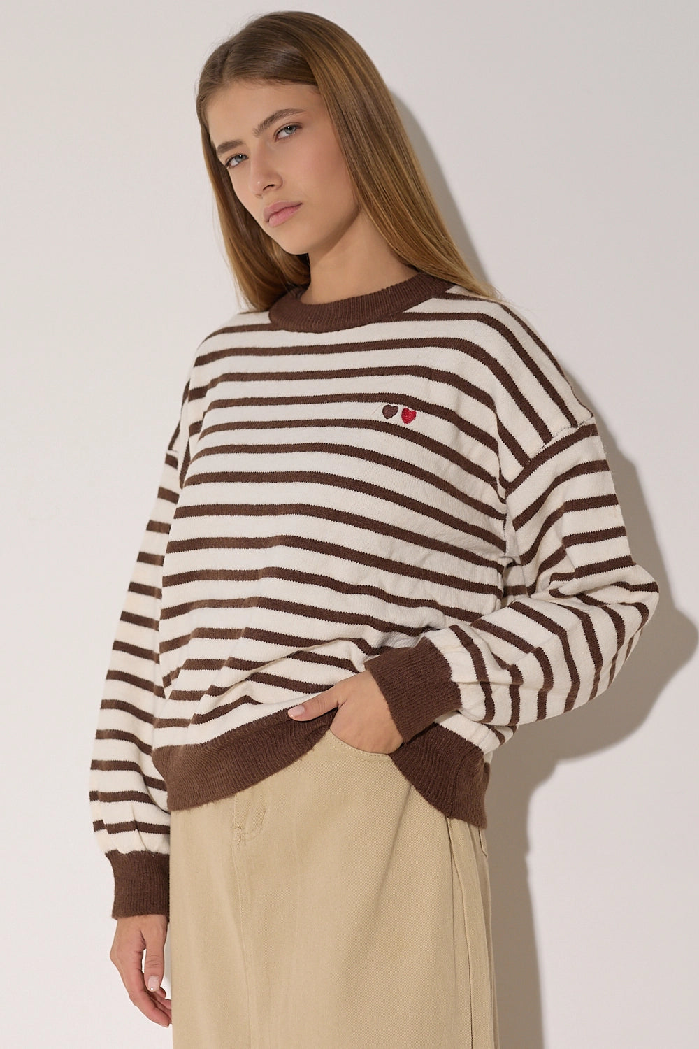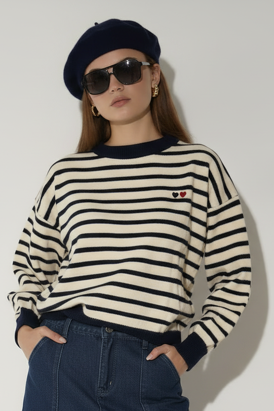 סריג מפוספס קלאסי בגזרה אוברסייז נוחה בצבעים חמים. עם פרט לבבות רקום המוסיף נופך של עדינות ונשיות לדוגמת הסריג.