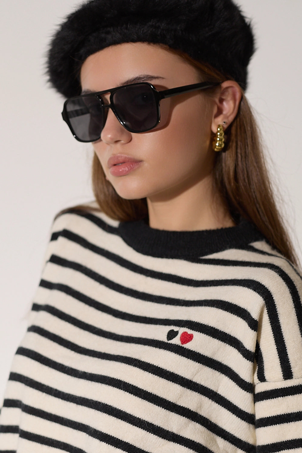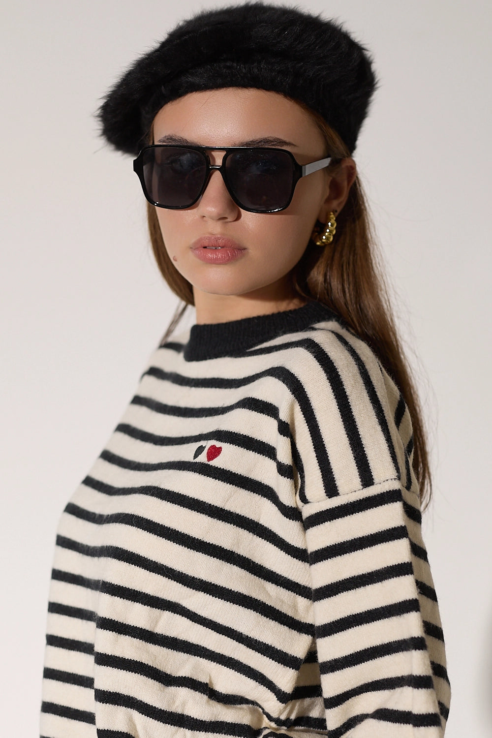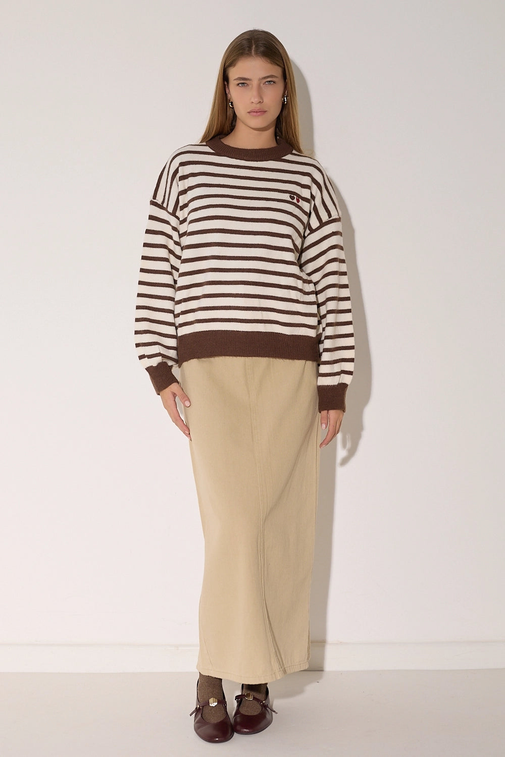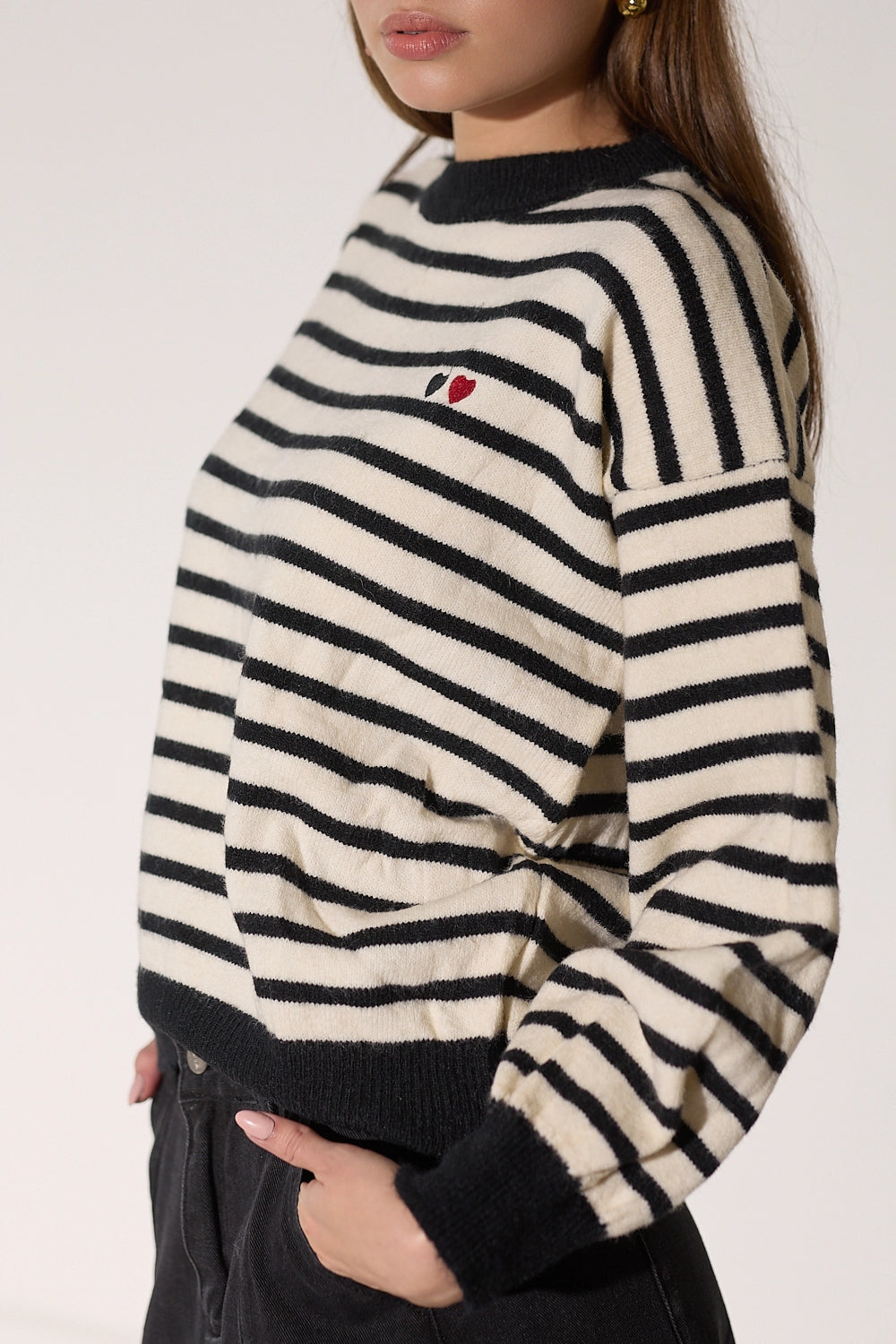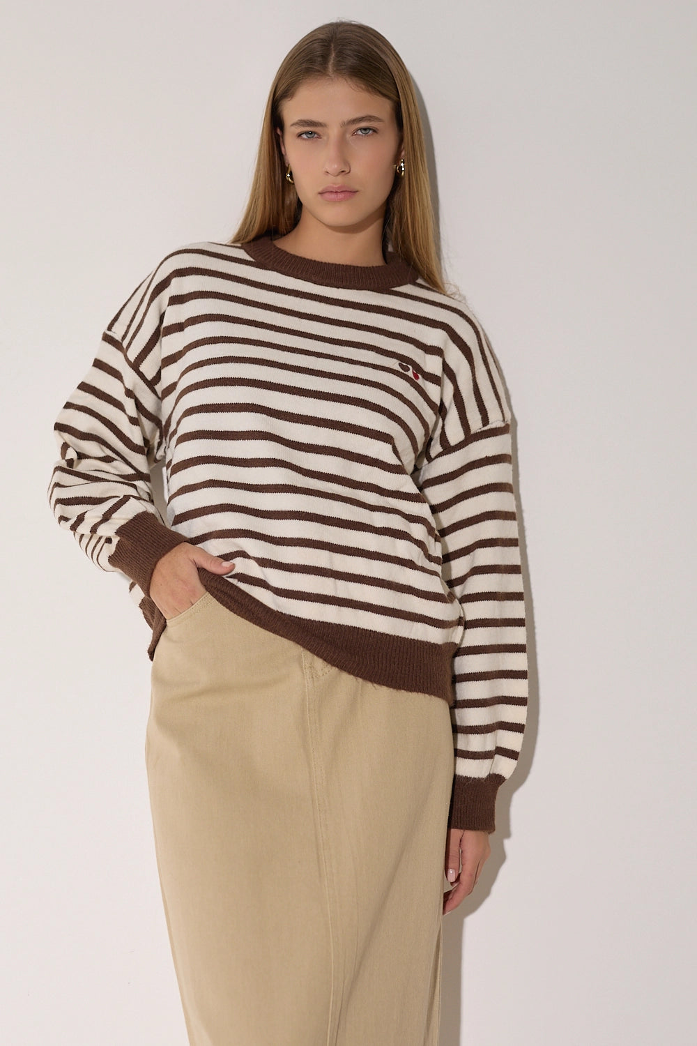 סריג מפוספס קלאסי בגזרה אוברסייז נוחה בצבעים חמים. עם פרט לבבות רקום המוסיף נופך של עדינות ונשיות לדוגמת הסריג.