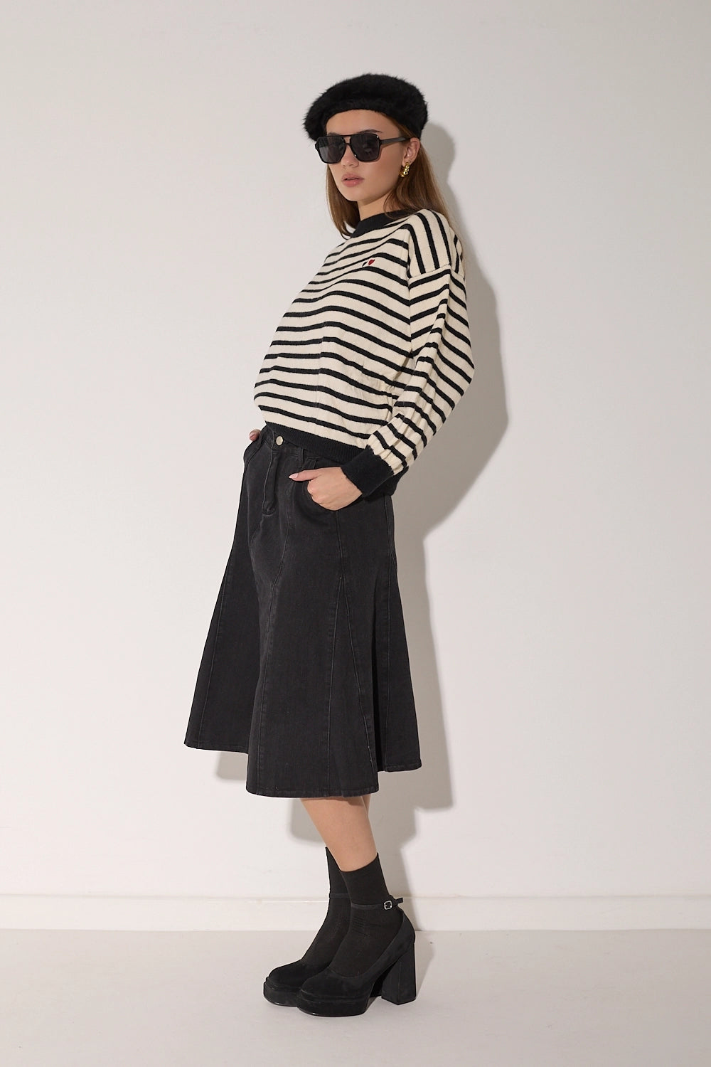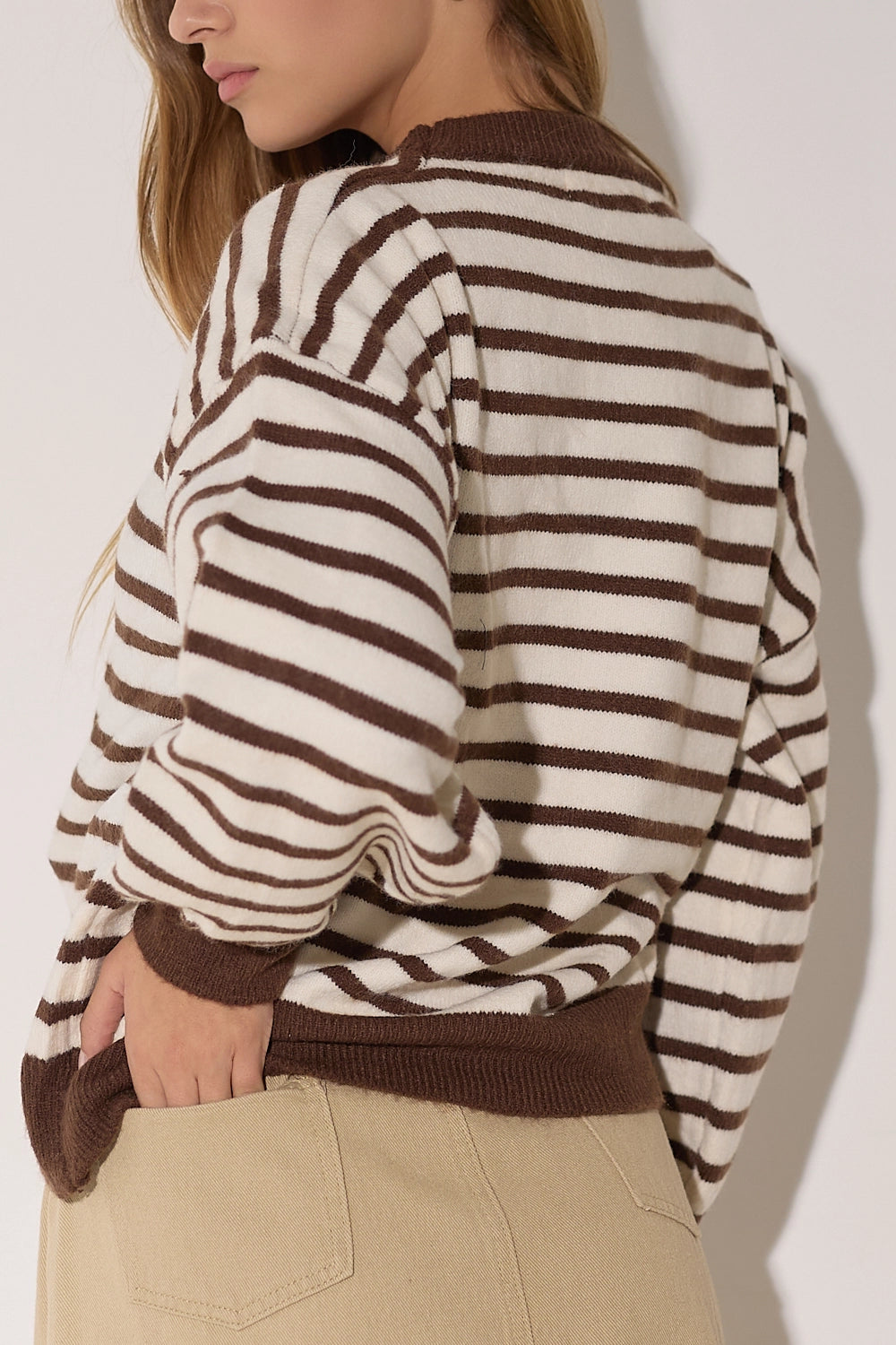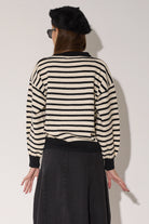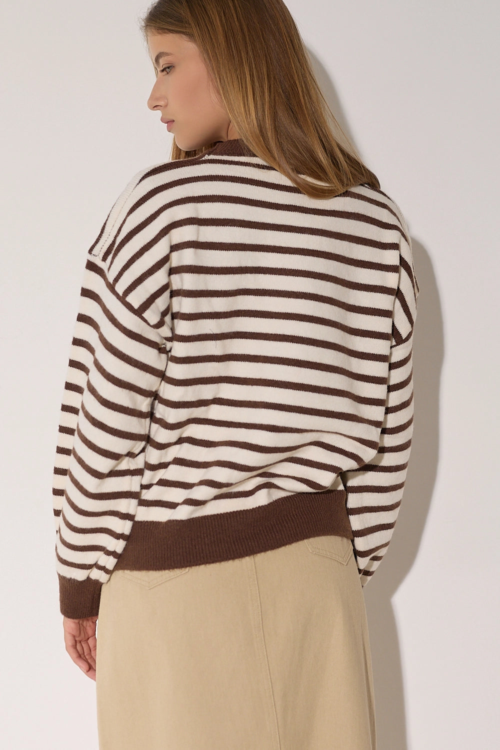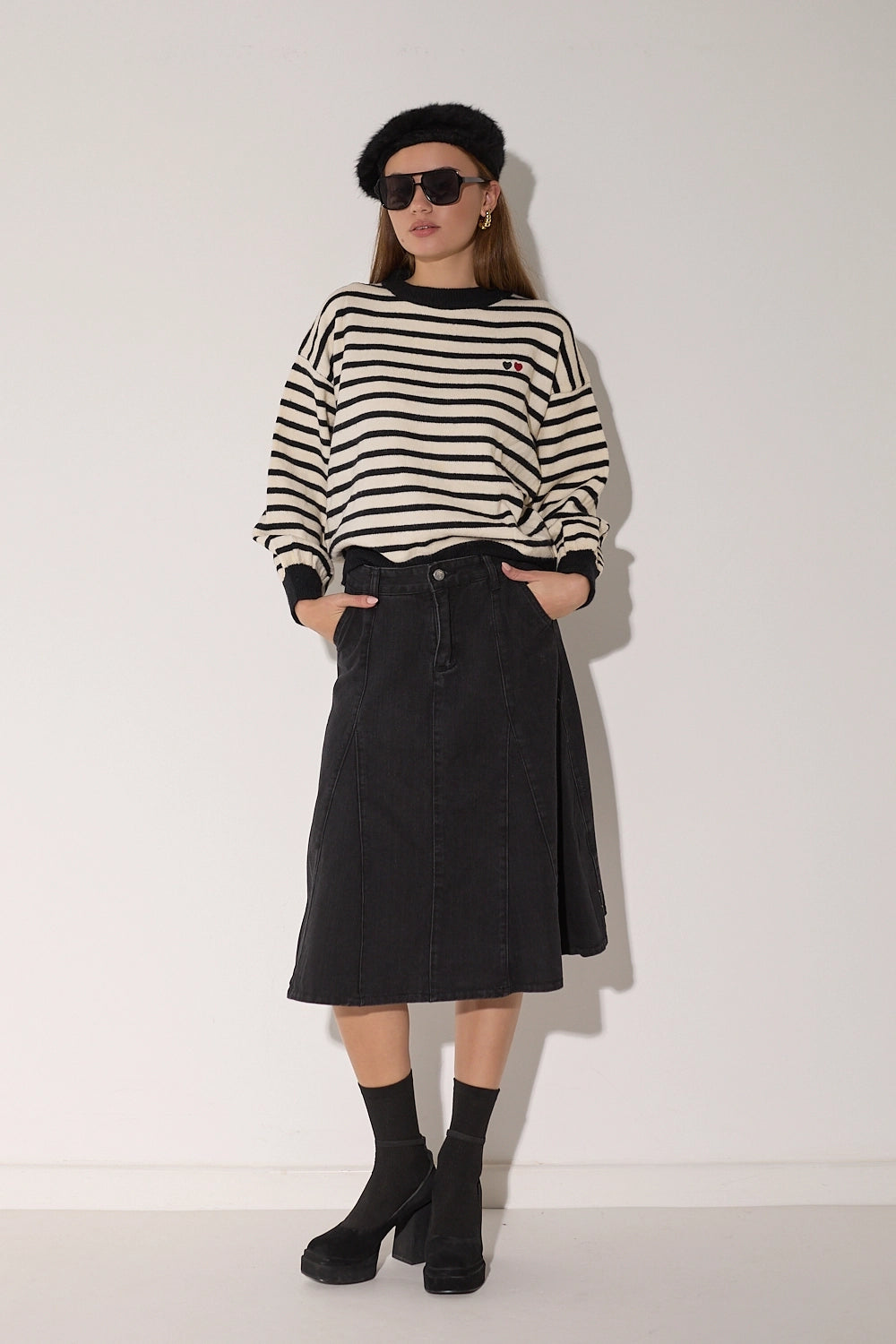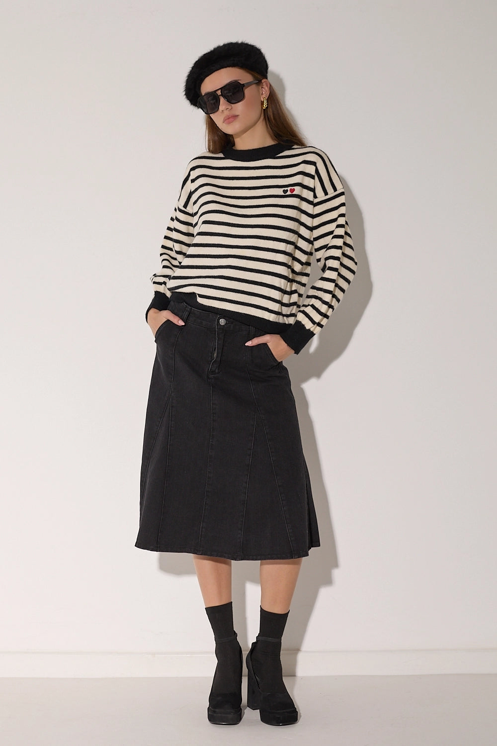 סריג מפוספס קלאסי בגזרה אוברסייז נוחה בצבעים חמים. עם פרט לבבות רקום המוסיף נופך של עדינות ונשיות לדוגמת הסריג.