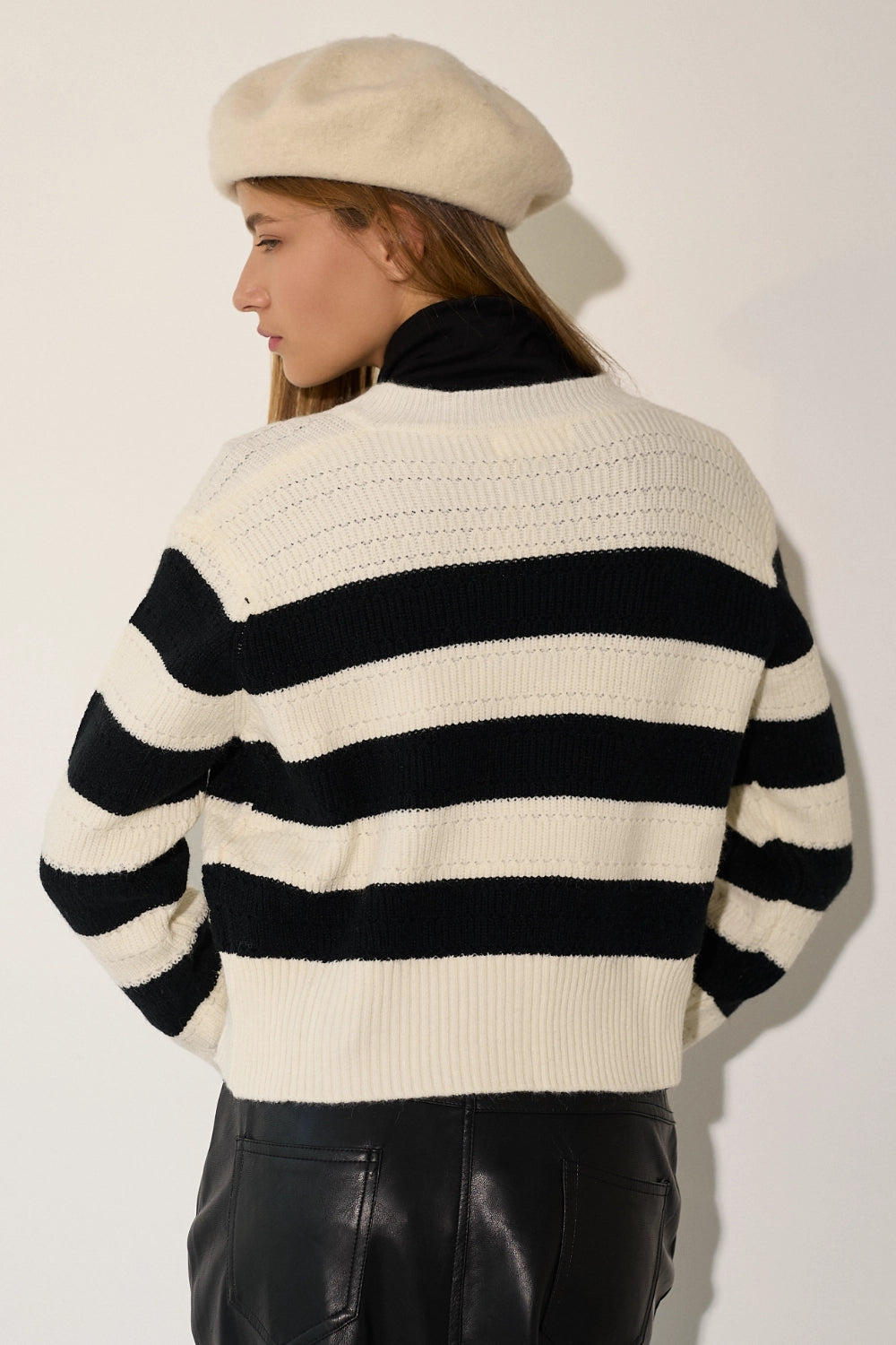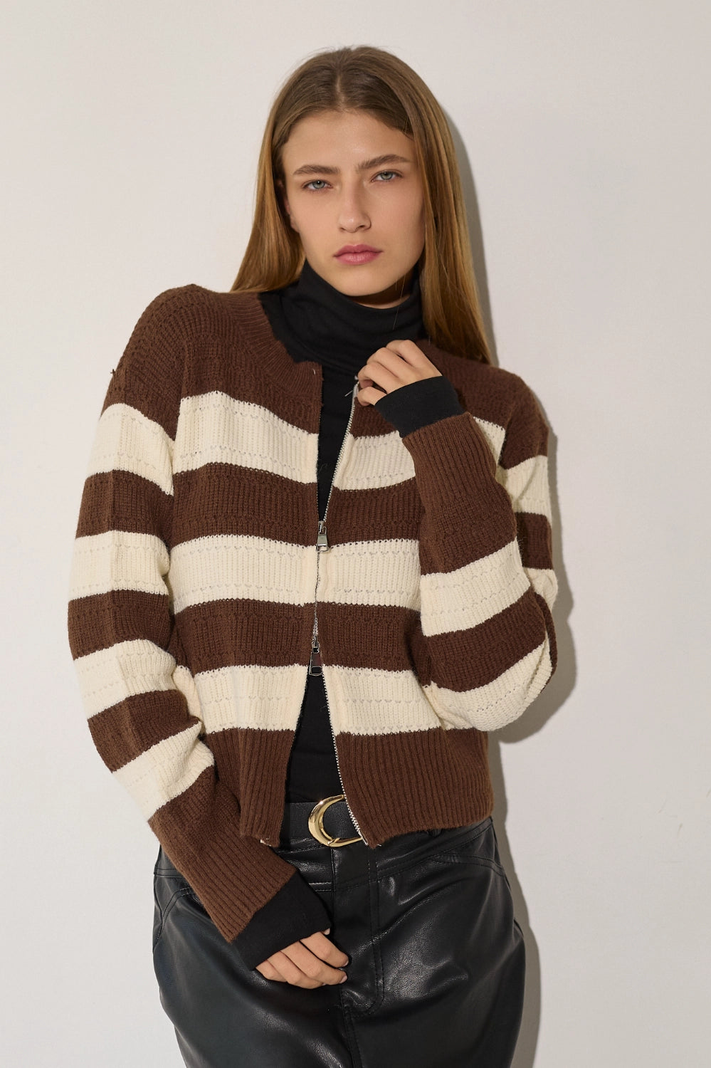 קרדיגן סרוג מעוצב בפסים רחבים בגוונים טרנדיים, עם רוכסן מלא לנוחות מקסימלית. העיצוב הקלאס והצבעים החמים הופכים אותו לפריט חובה לעונה. הקרדיגן המושלם למעבר בין עונות. מתאים במיוחד ללוקים קז'ואל-שיק ולשכבות אלגנטיות.