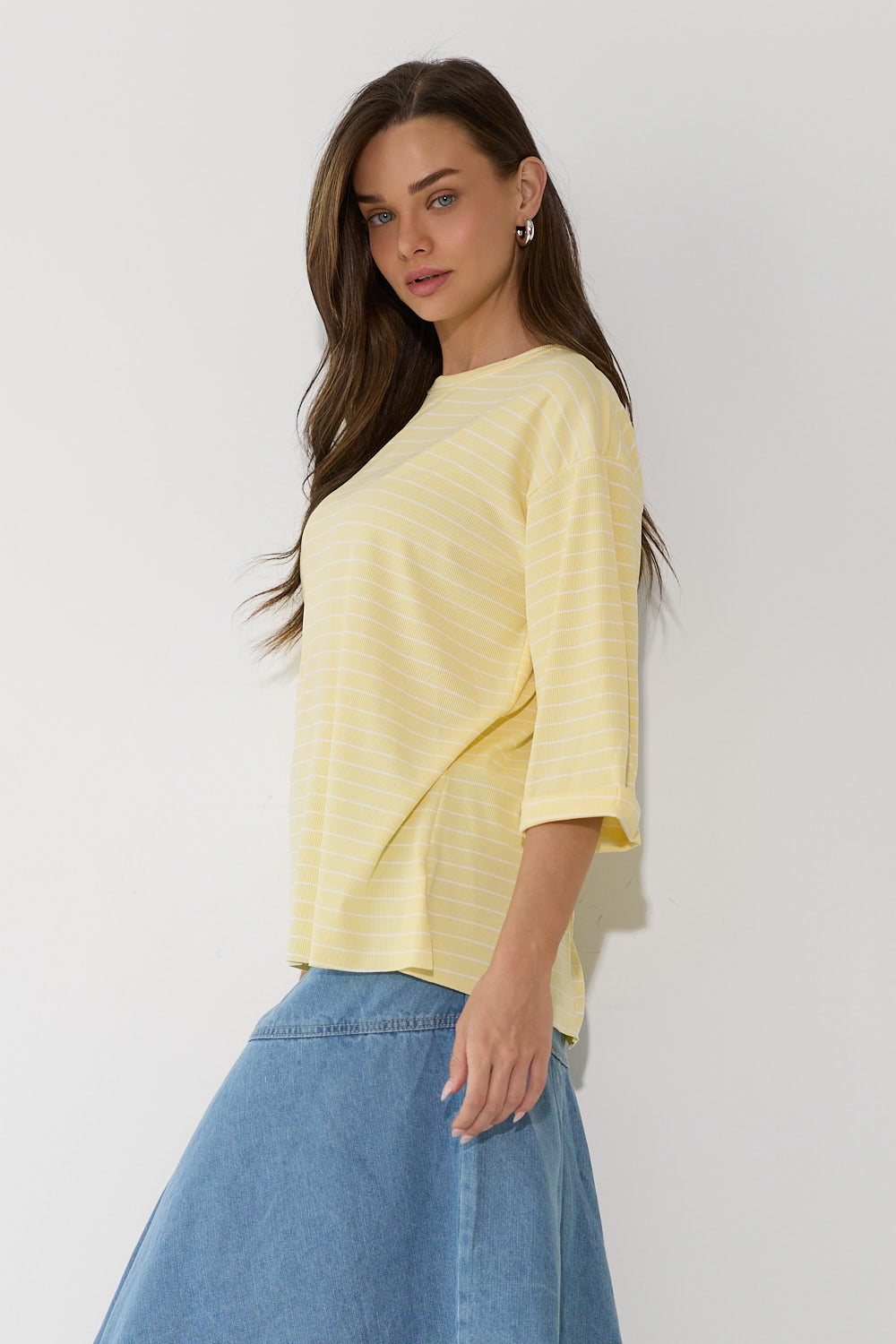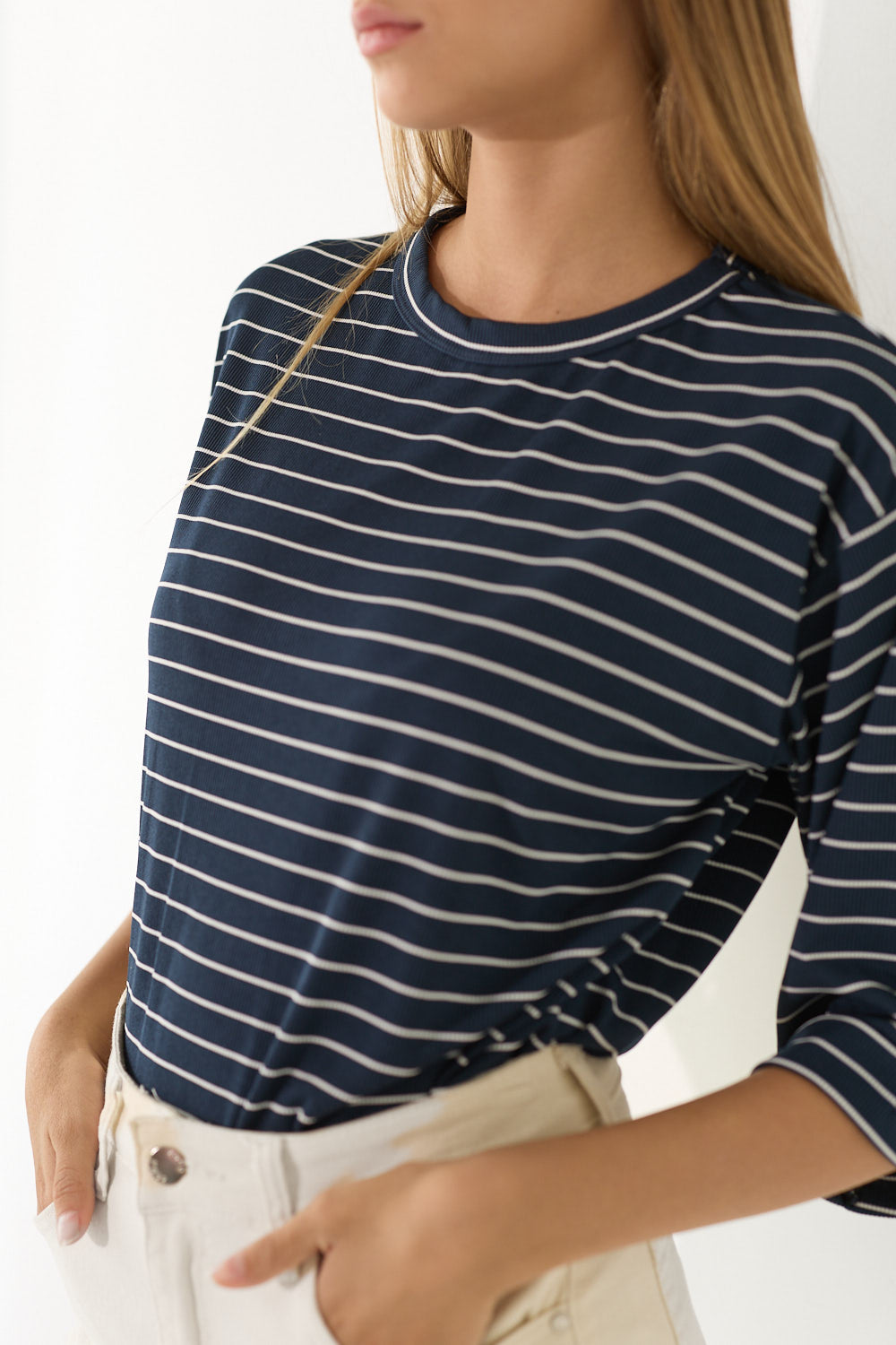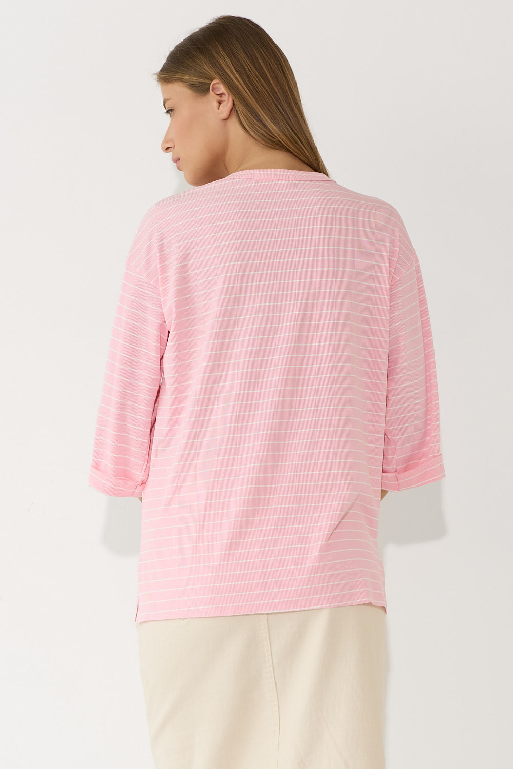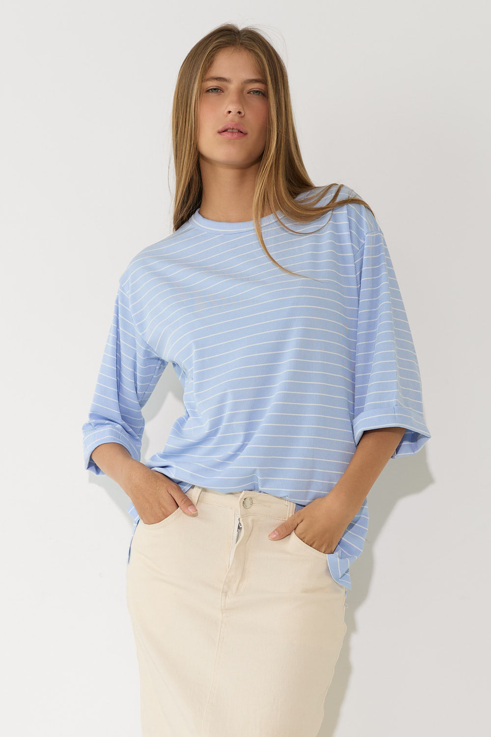 חולצה אוברסייז פסים שרוול קיפול בגזרה רחבה ומשוחררת, עם פסים עדינים ושרוול מקופל שמוסיף נגיעת סטייל ואופנתיות. בד נוח ונעים שמרגיש קל ומרענן לאורך כל היום – פריט קז'ואל שמשדרג כל לוק בפרט עיצובי ייחודי. לבשי אותה עם חצאית ג'ינס צמוד לאיזון הגזרה הרחבה, מכונסת לתוך חצאית מידי לאאוטפיט מוקפד.