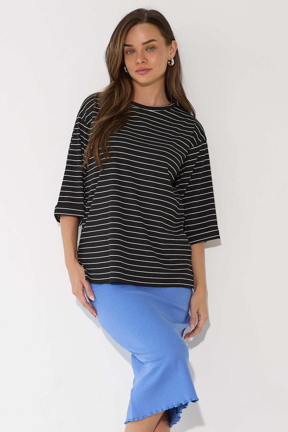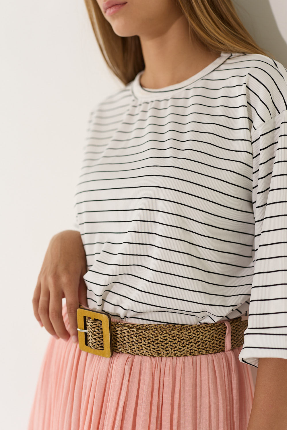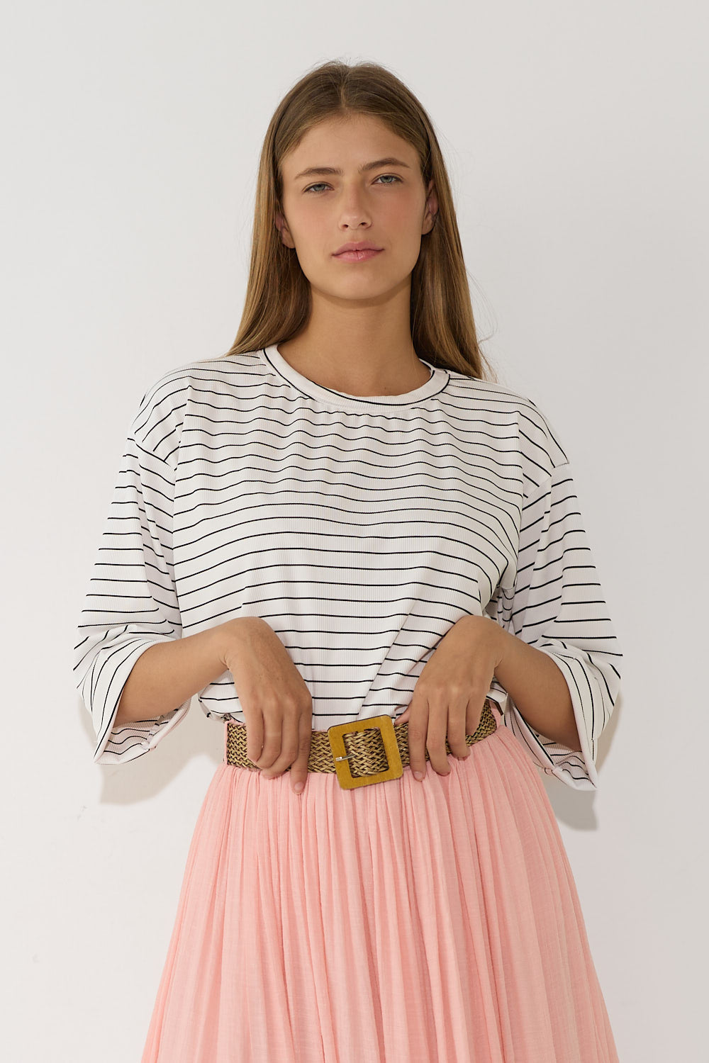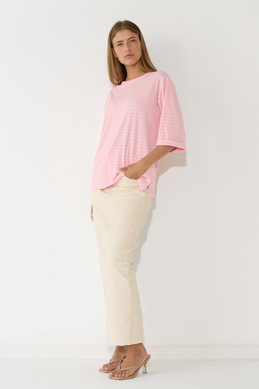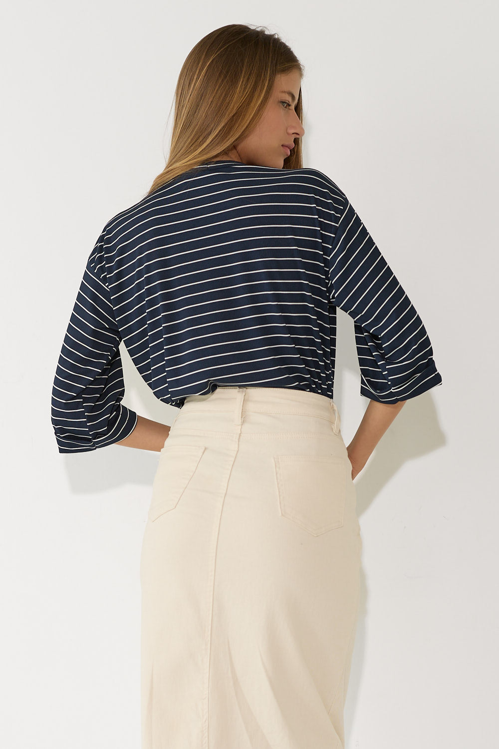 חולצה אוברסייז פסים שרוול קיפול בגזרה רחבה ומשוחררת, עם פסים עדינים ושרוול מקופל שמוסיף נגיעת סטייל ואופנתיות. בד נוח ונעים שמרגיש קל ומרענן לאורך כל היום – פריט קז'ואל שמשדרג כל לוק בפרט עיצובי ייחודי. לבשי אותה עם חצאית ג'ינס צמוד לאיזון הגזרה הרחבה, מכונסת לתוך חצאית מידי לאאוטפיט מוקפד.