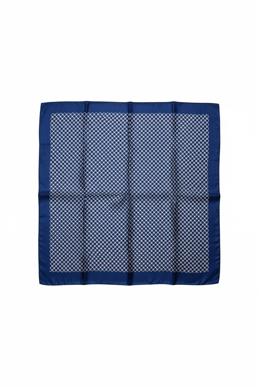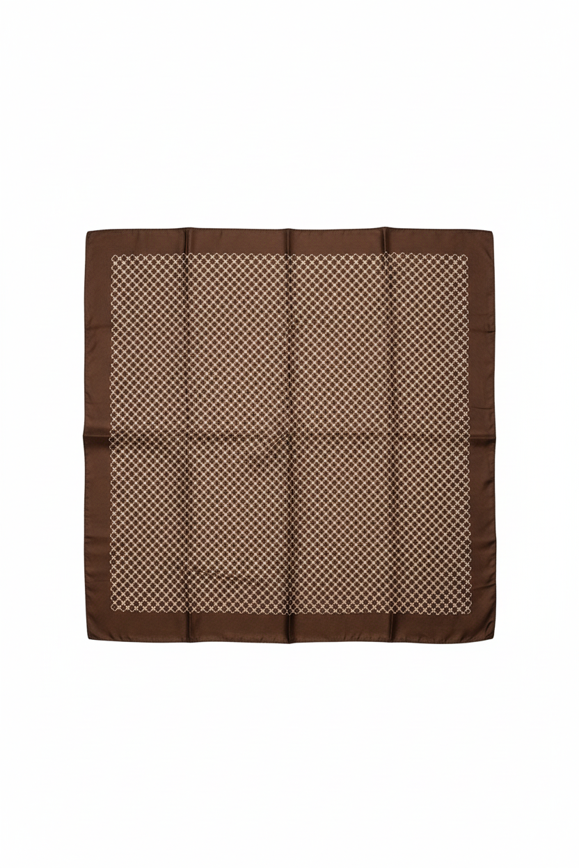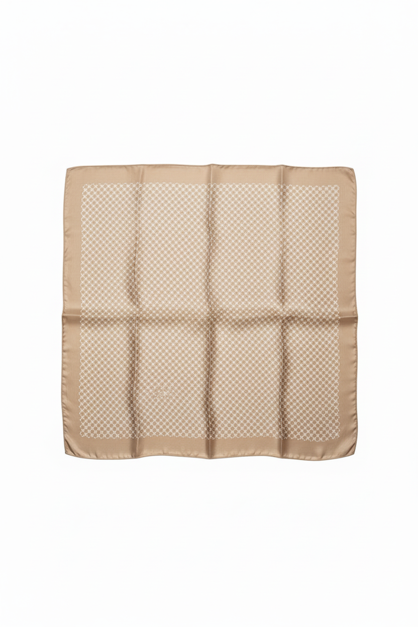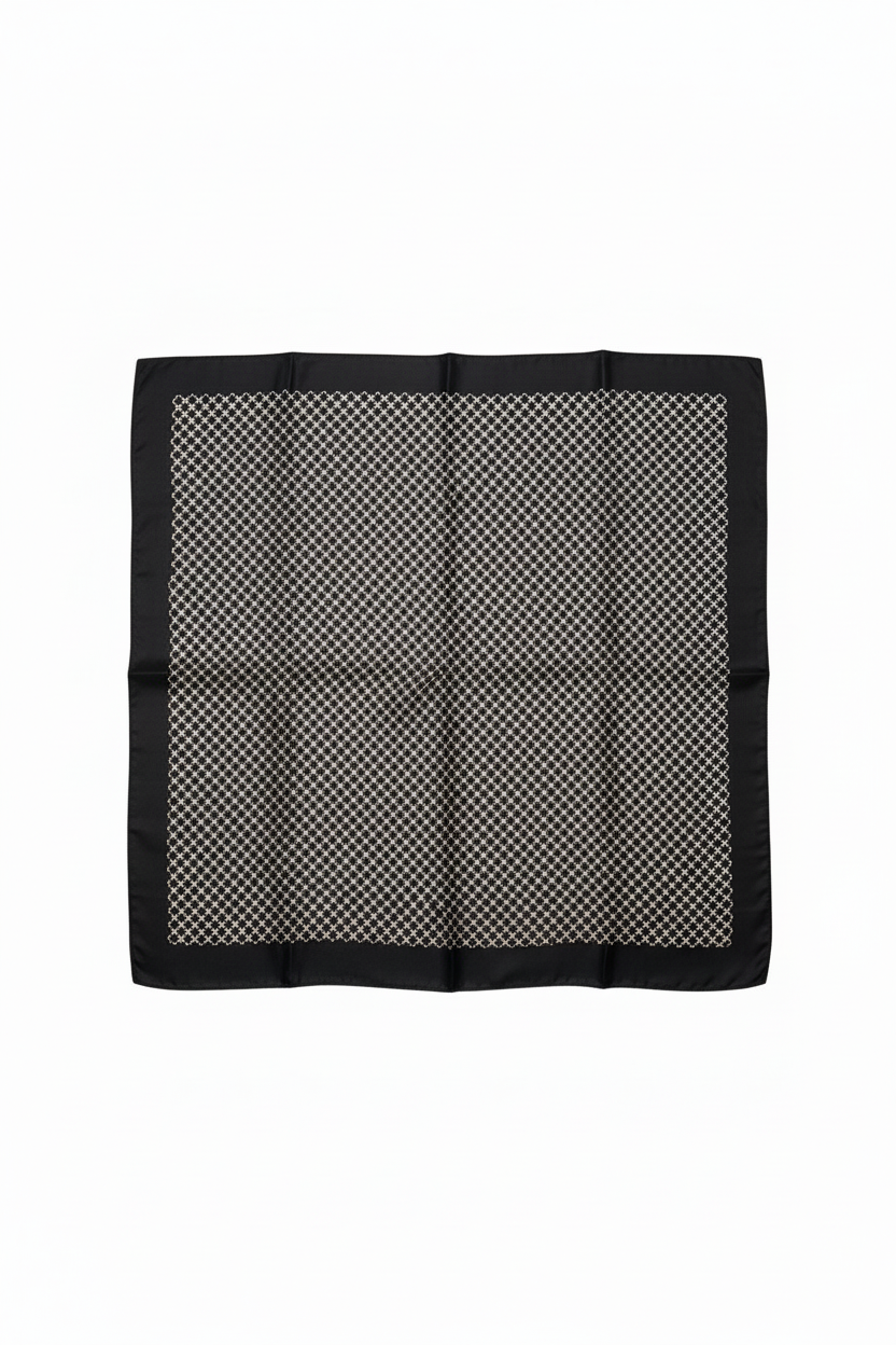 מטפחת משי מרובעת פרימיום בעיצוב קלאסי ומתוחכם. המטפחת בעלת פטרן גיאומטרי מעודן של תלתנים קטנים המחוברים זה לזה באמצעי קישוט דקורטיביים דמויי שרשרת. הפטרן צפוף ועדין, היוצר טקסטורה .עשירה ומפורטת