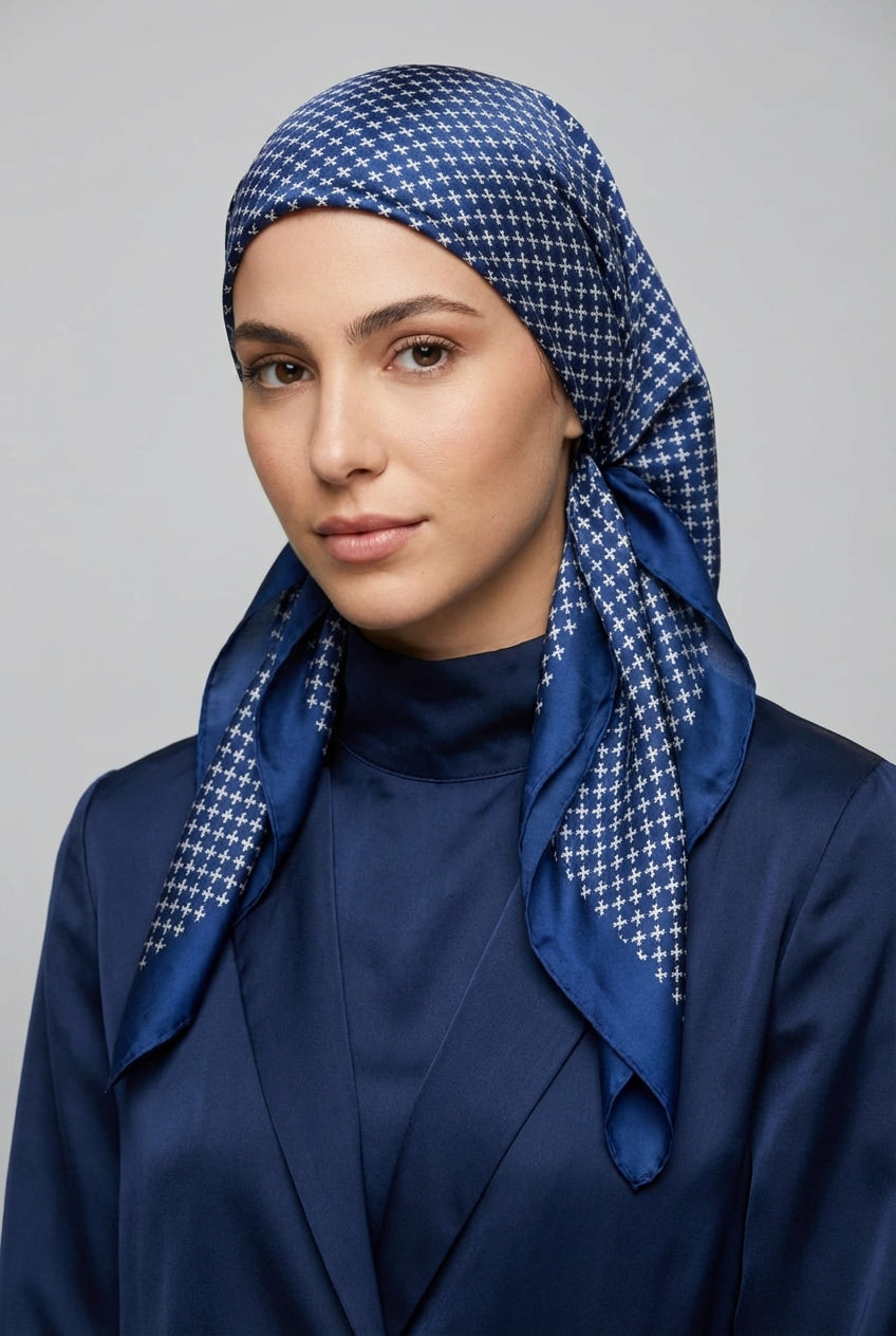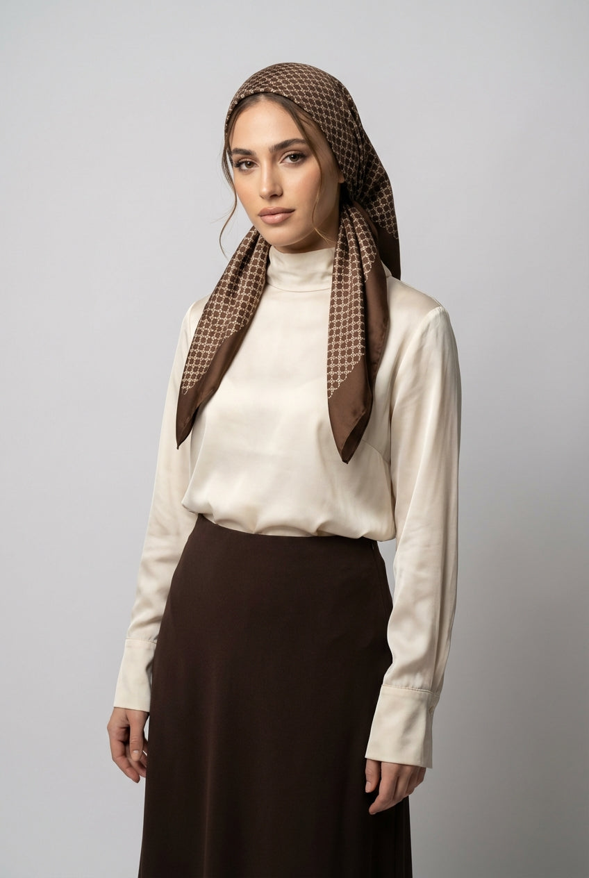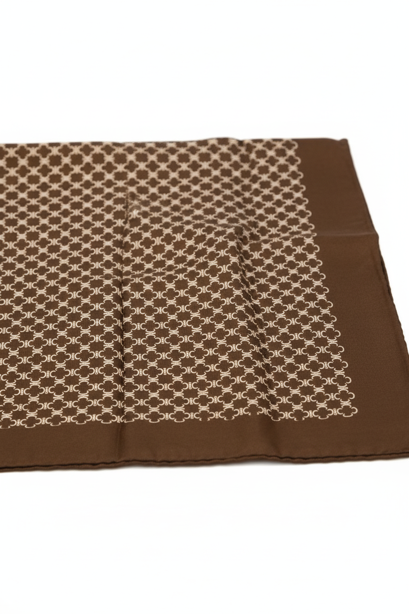 מטפחת משי מרובעת פרימיום בעיצוב קלאסי ומתוחכם. המטפחת בעלת פטרן גיאומטרי מעודן של תלתנים קטנים המחוברים זה לזה באמצעי קישוט דקורטיביים דמויי שרשרת. הפטרן צפוף ועדין, היוצר טקסטורה .עשירה ומפורטת
