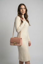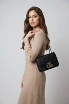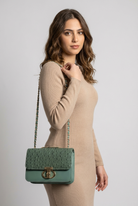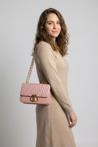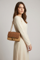 A perfect clutch bag for evening and beach with a gold-tone loop chain strap.