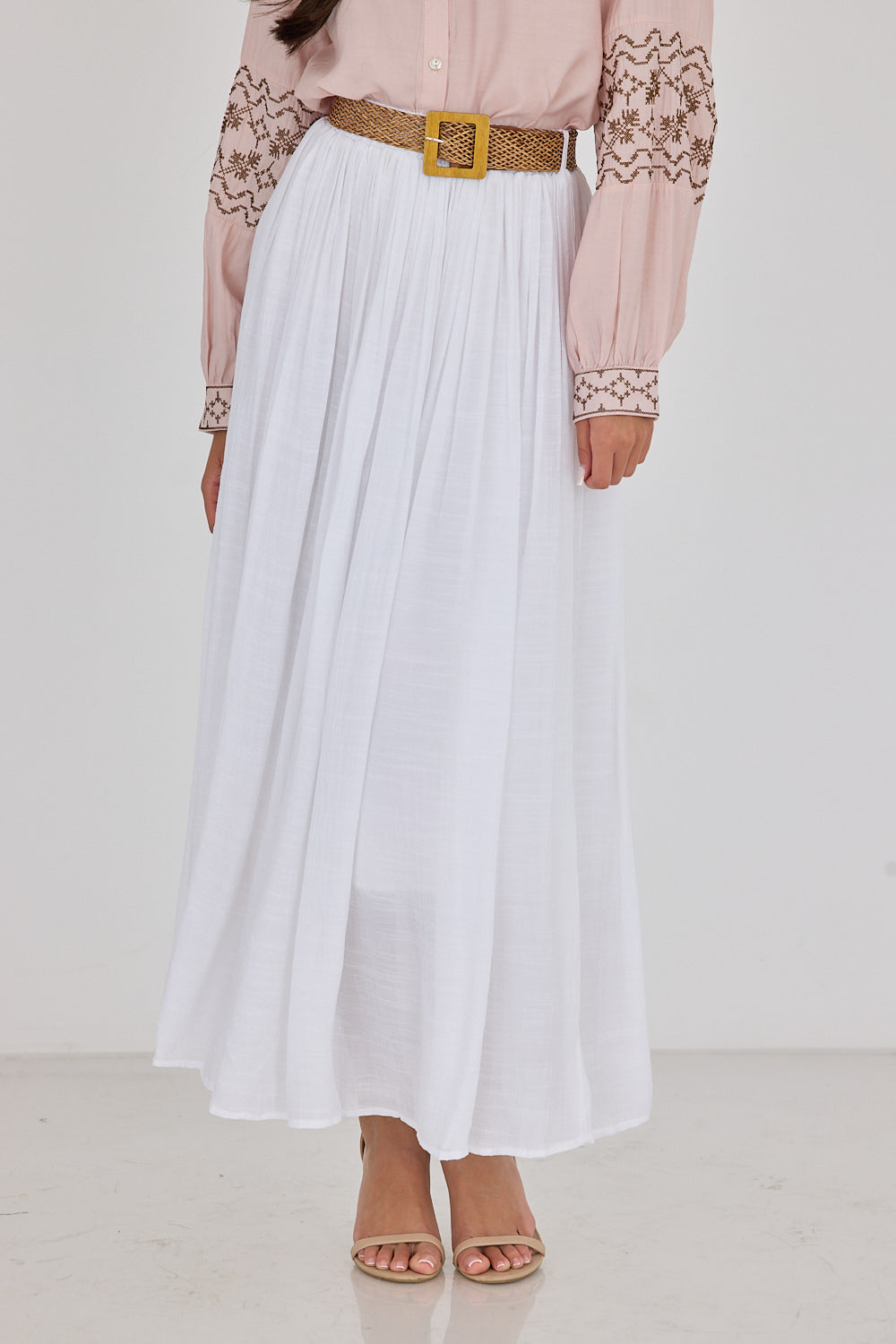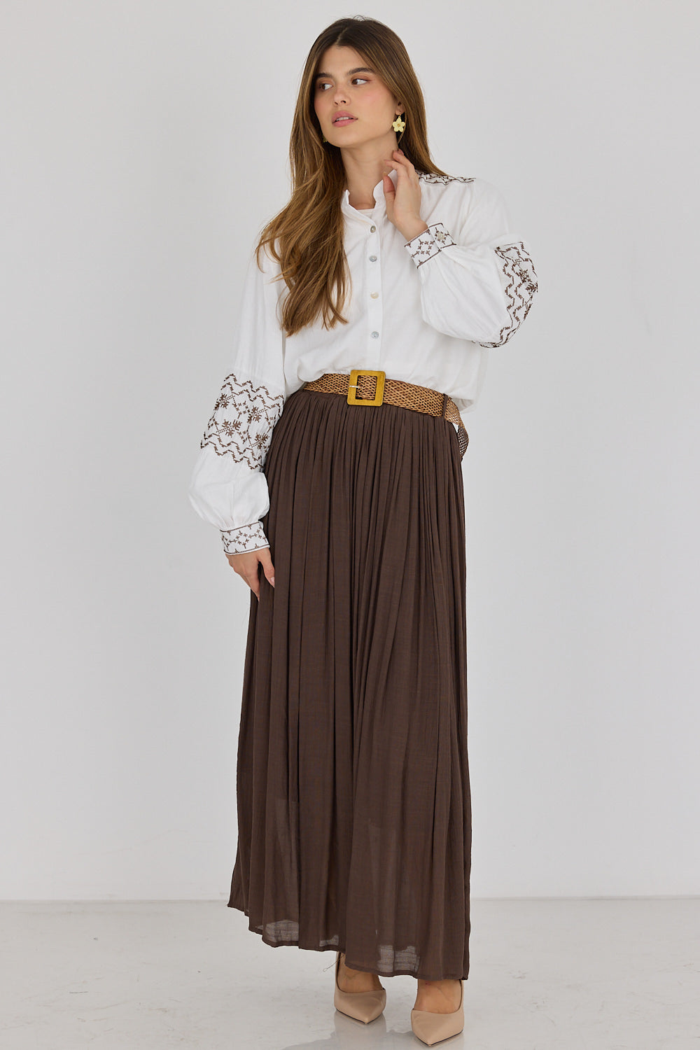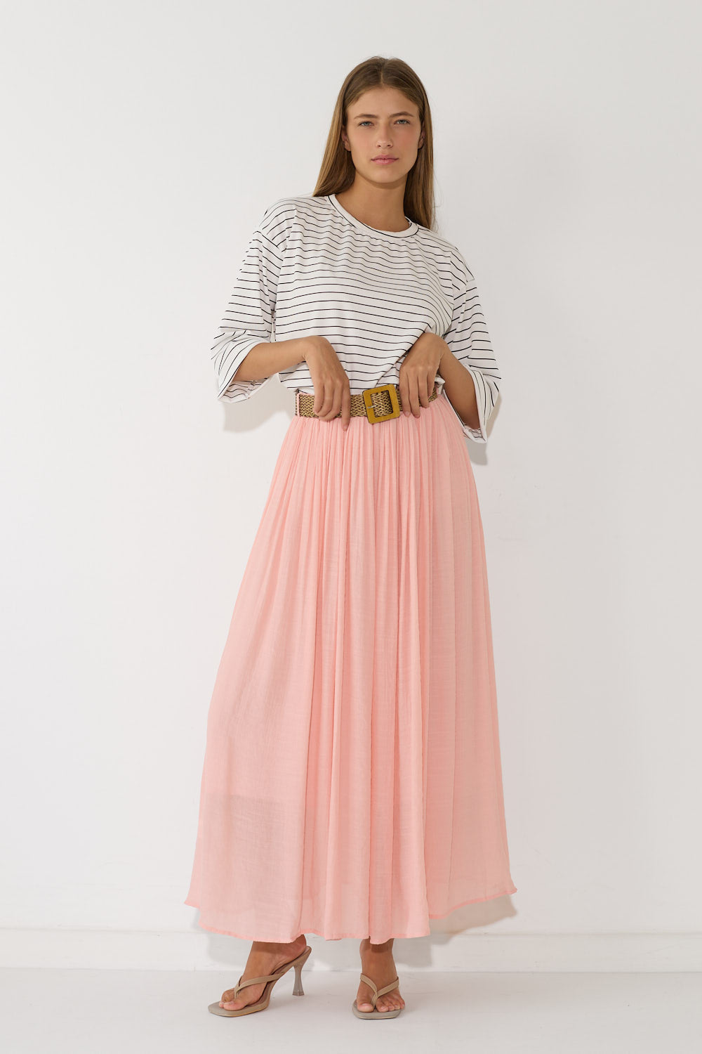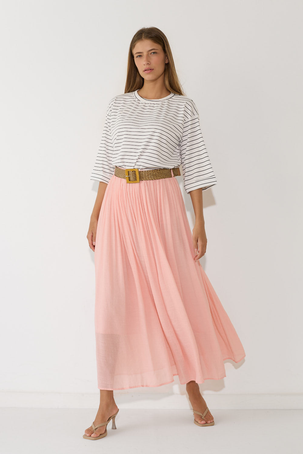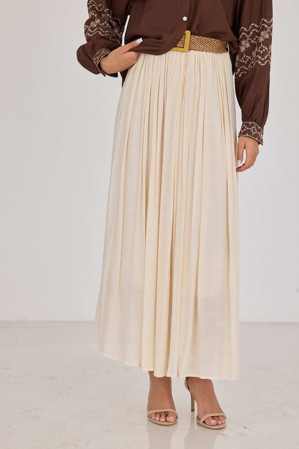 חצאית לין בגזרה זורמת ומחמיאה, עם בד עדין ונעים שמשדר סטייל בוהמי ונשי. מגיעה עם חגורת קש קלועה להשלמת הלוק – פרט עיצובי שמוסיף קסם ומחמיא למותן. שלבי אותה עם חולצה בייסיק לסטייל קז'ואל יומיומי, עם גוף צמוד לאאוטפיט ערב מחמיא, או עם חולצה מכופתרת.