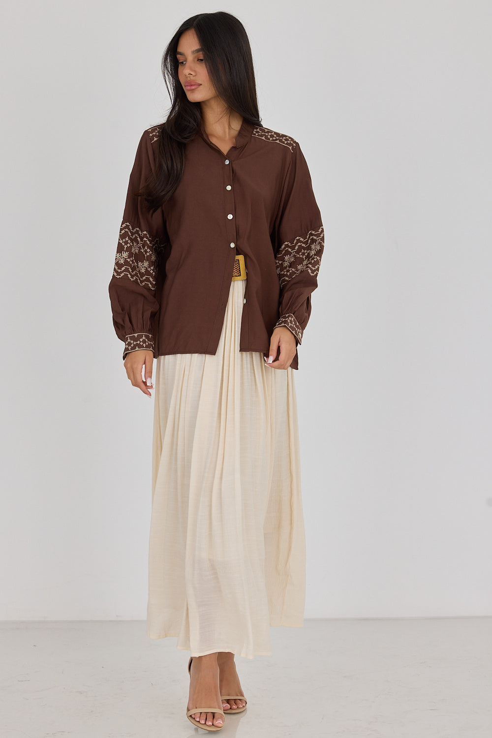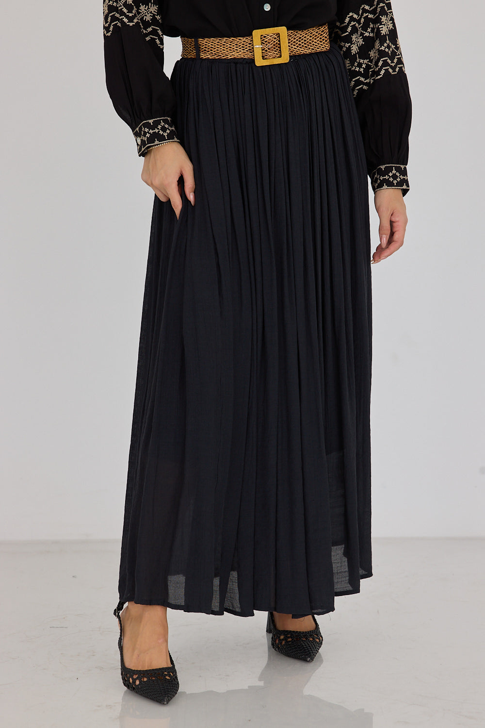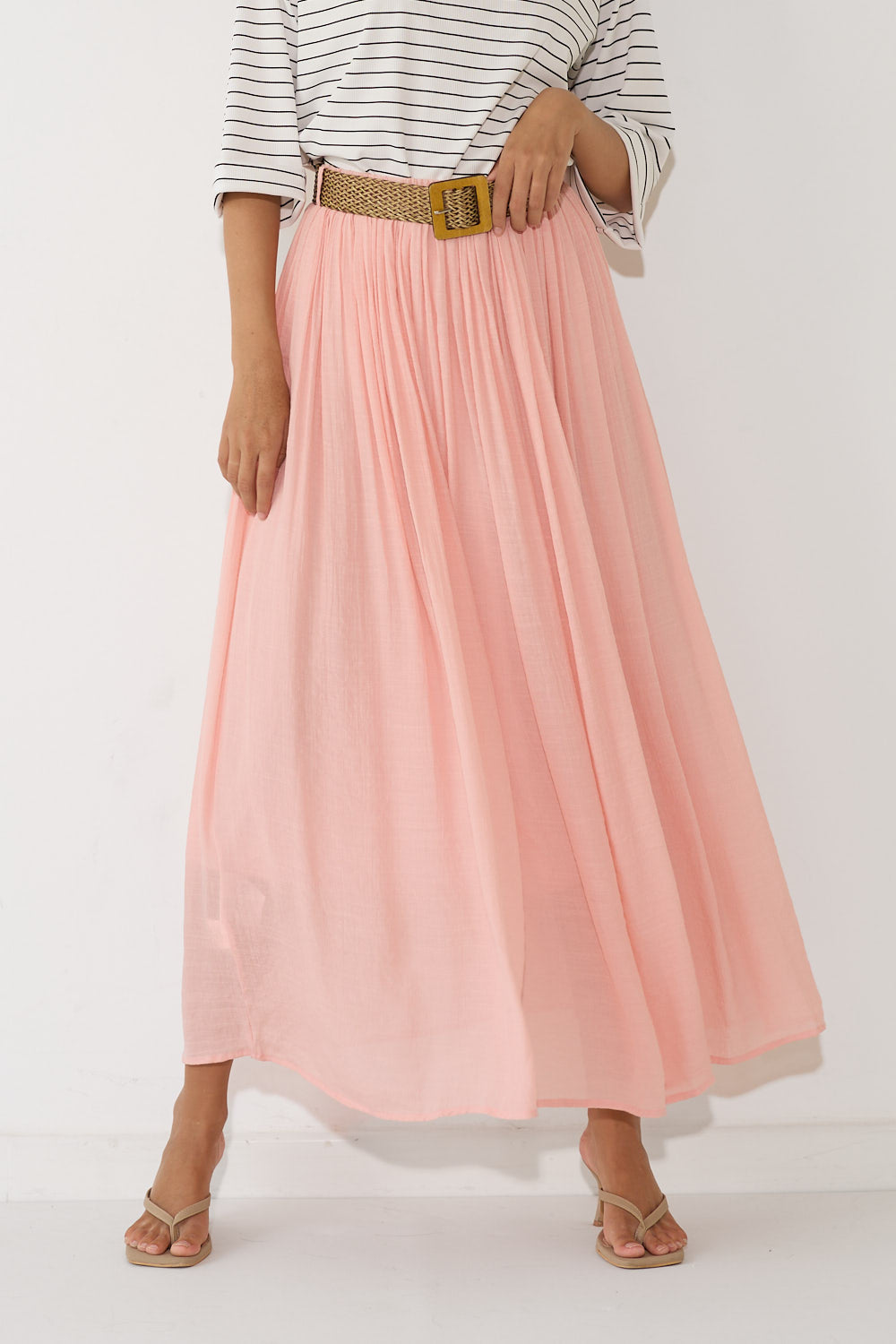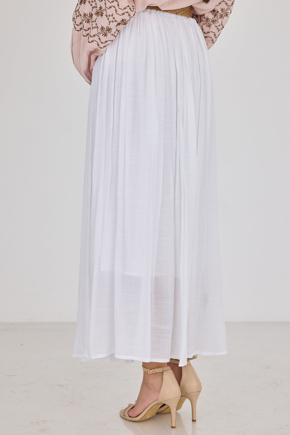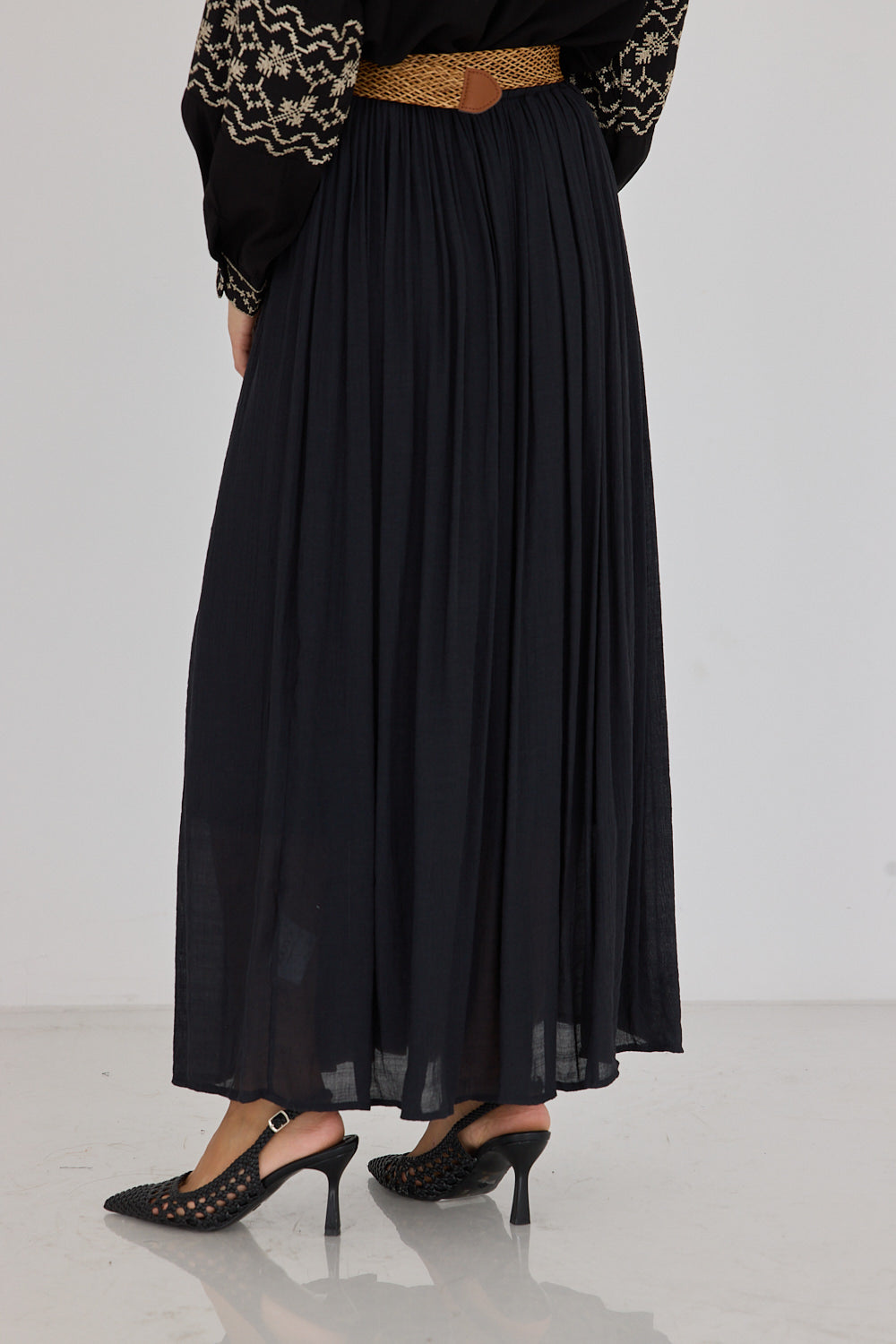 חצאית לין בגזרה זורמת ומחמיאה, עם בד עדין ונעים שמשדר סטייל בוהמי ונשי. מגיעה עם חגורת קש קלועה להשלמת הלוק – פרט עיצובי שמוסיף קסם ומחמיא למותן. שלבי אותה עם חולצה בייסיק לסטייל קז'ואל יומיומי, עם גוף צמוד לאאוטפיט ערב מחמיא, או עם חולצה מכופתרת.