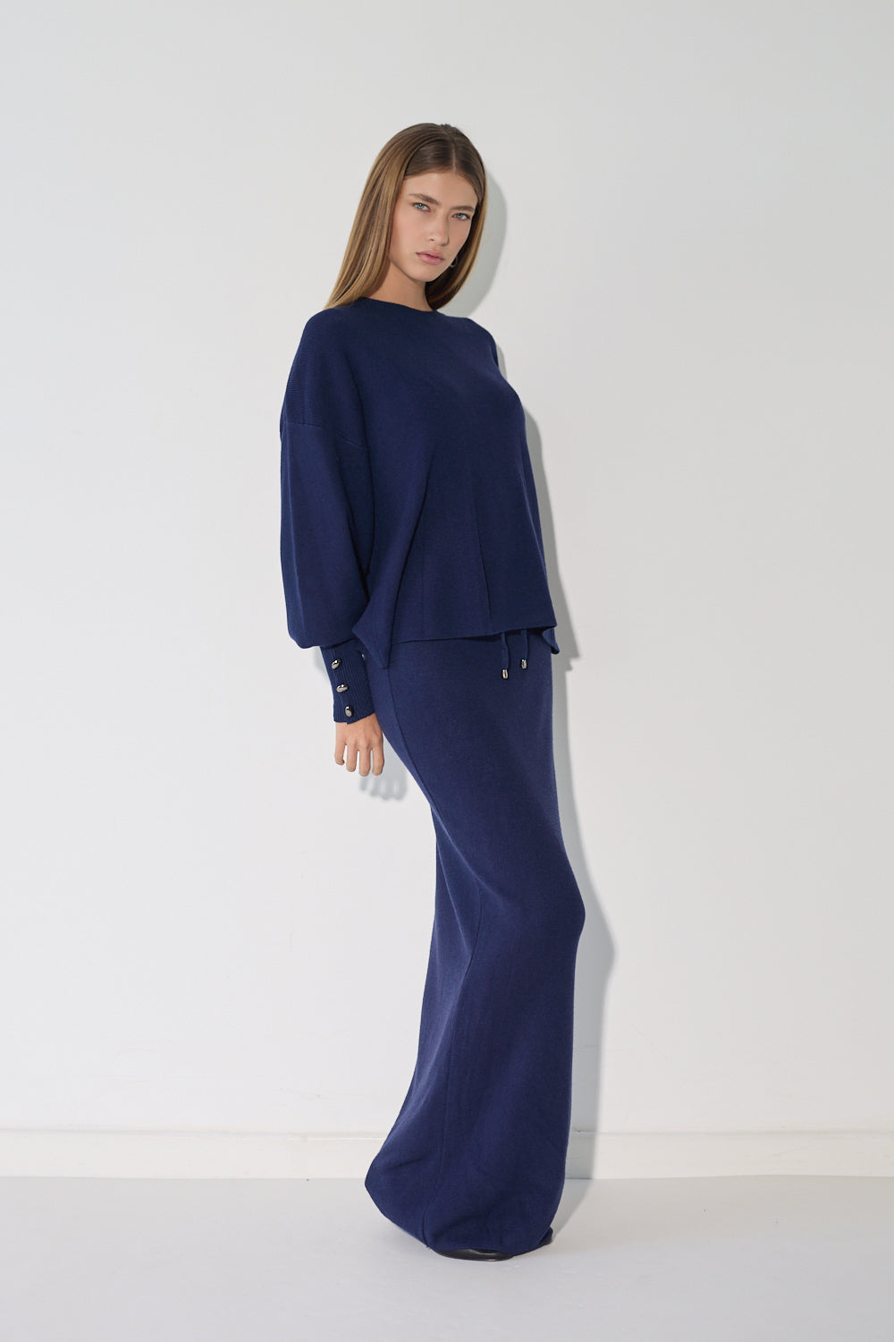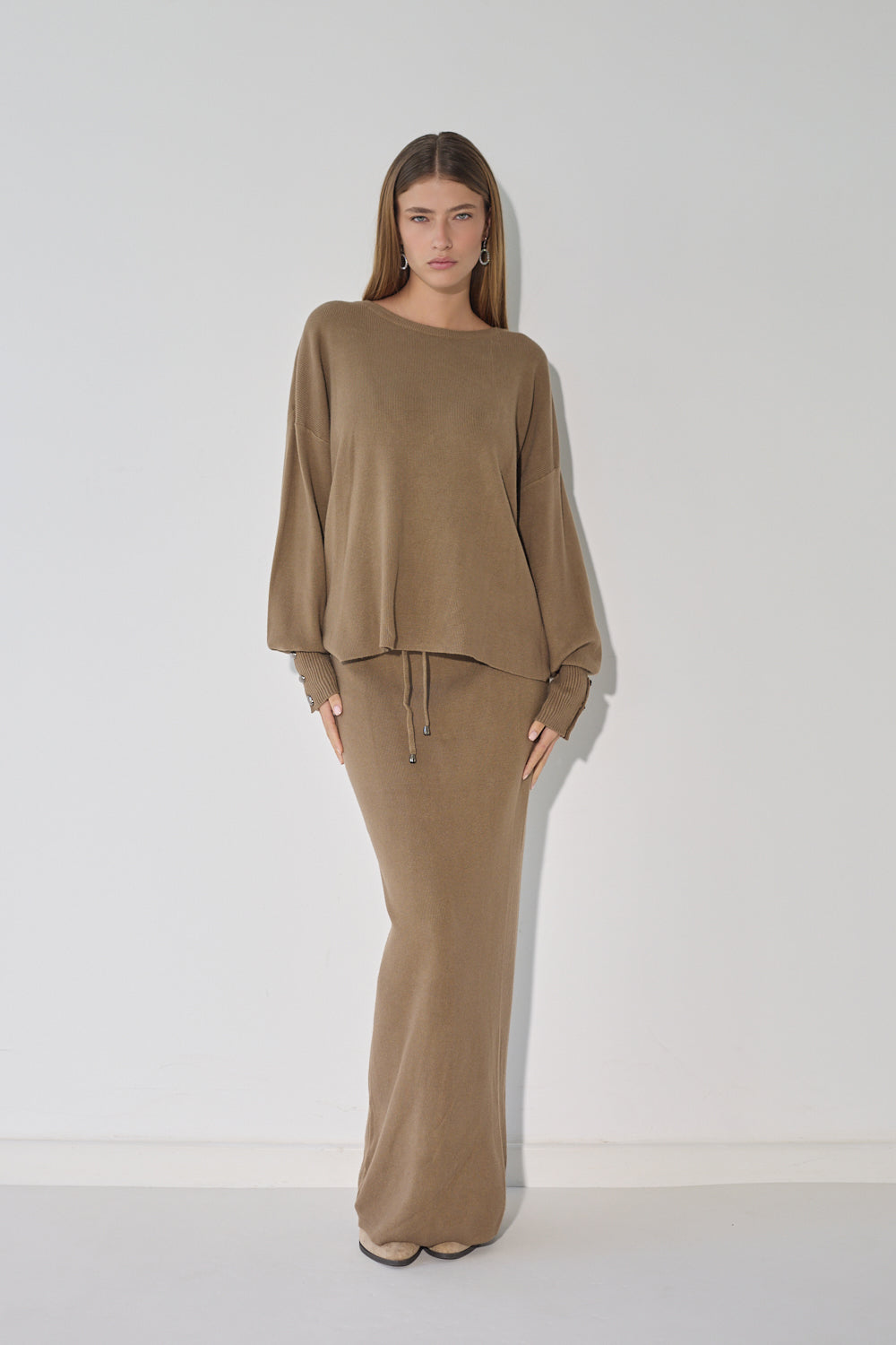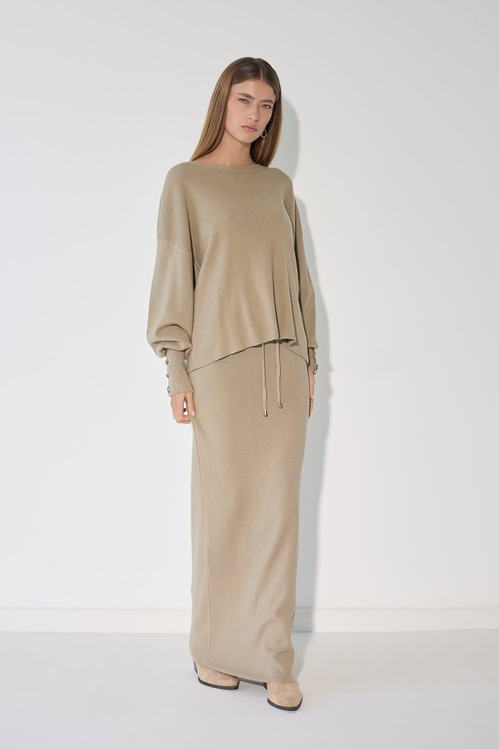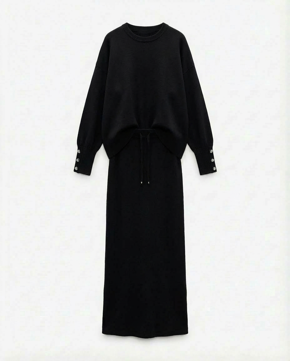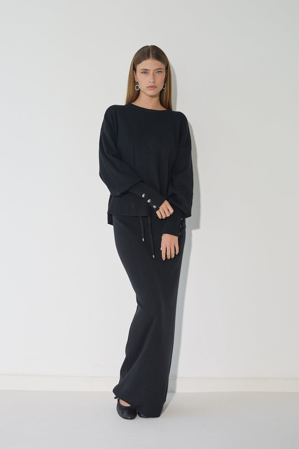 סט סריג תואם הכולל סוודר אוברסייז עם שרוולי ריב מעוטרים בכפתורים כסופים וחצאית שרוך תואמת, עשויים מבד סריג פרמיום ורך במיוחד.