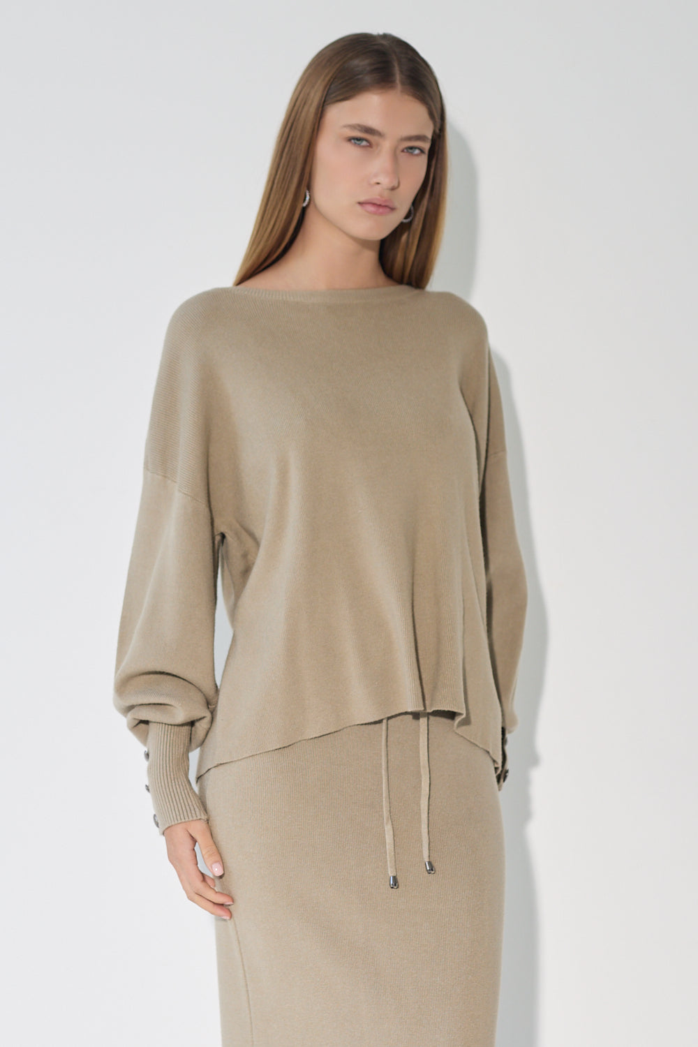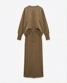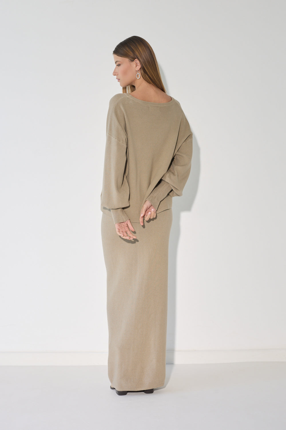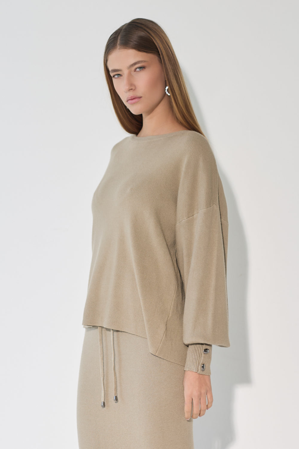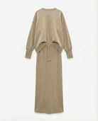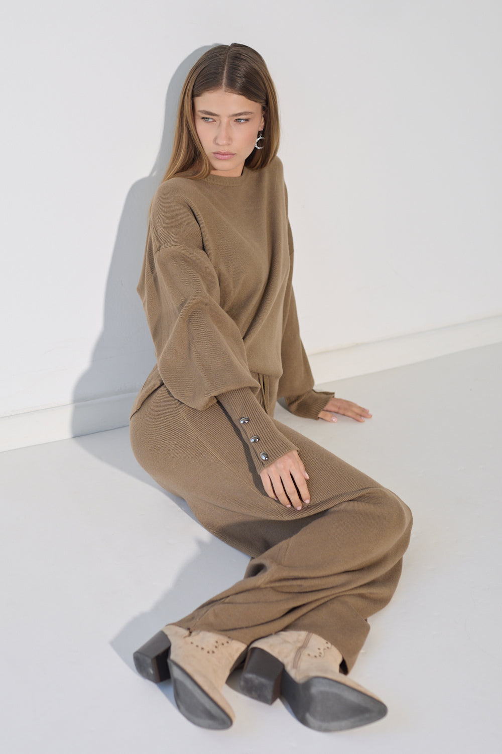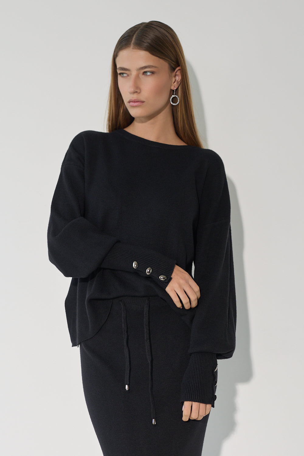סט סריג תואם הכולל סוודר אוברסייז עם שרוולי ריב מעוטרים בכפתורים כסופים וחצאית שרוך תואמת, עשויים מבד סריג פרמיום ורך במיוחד.