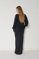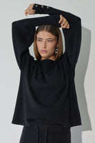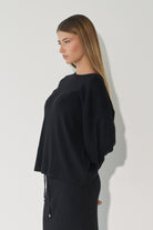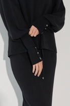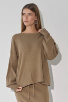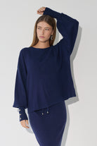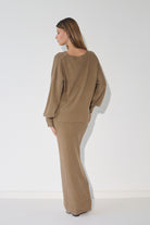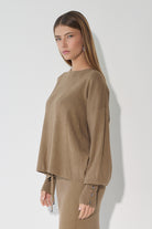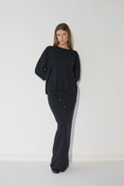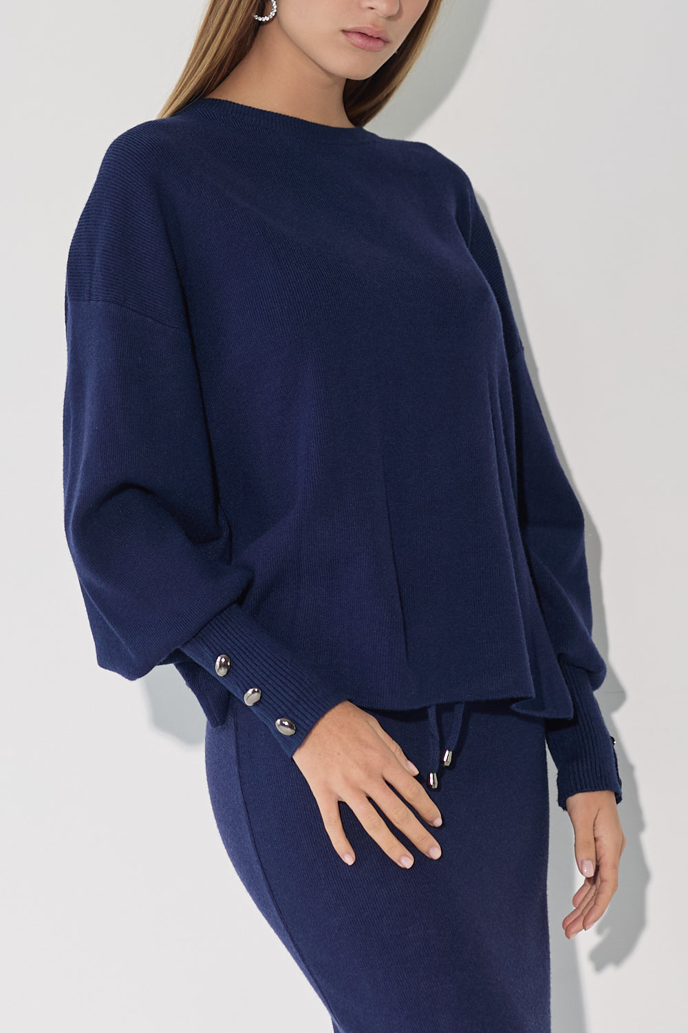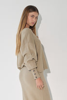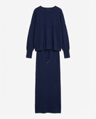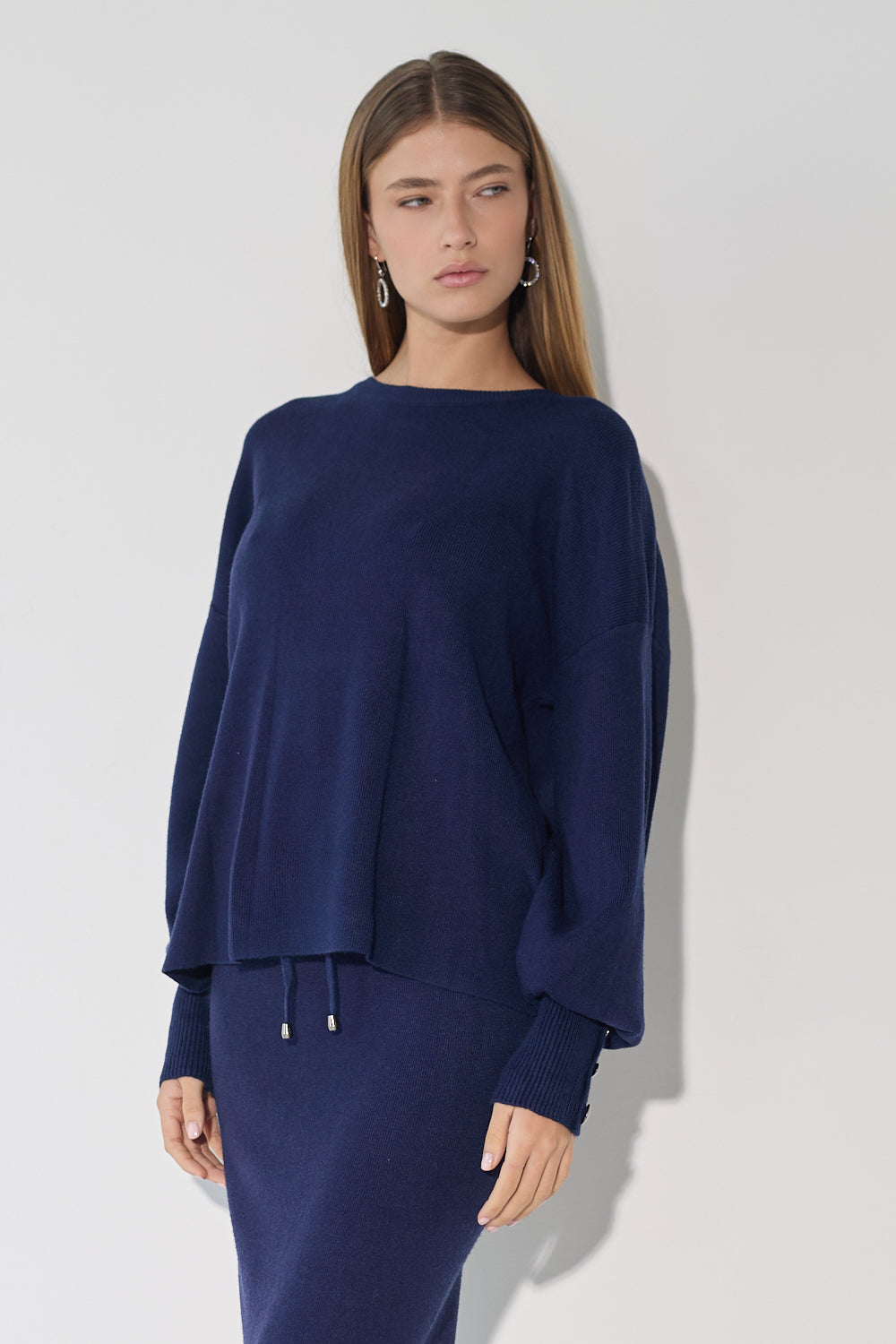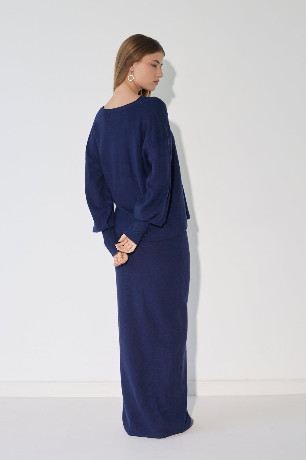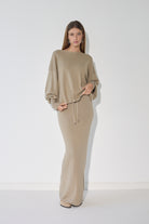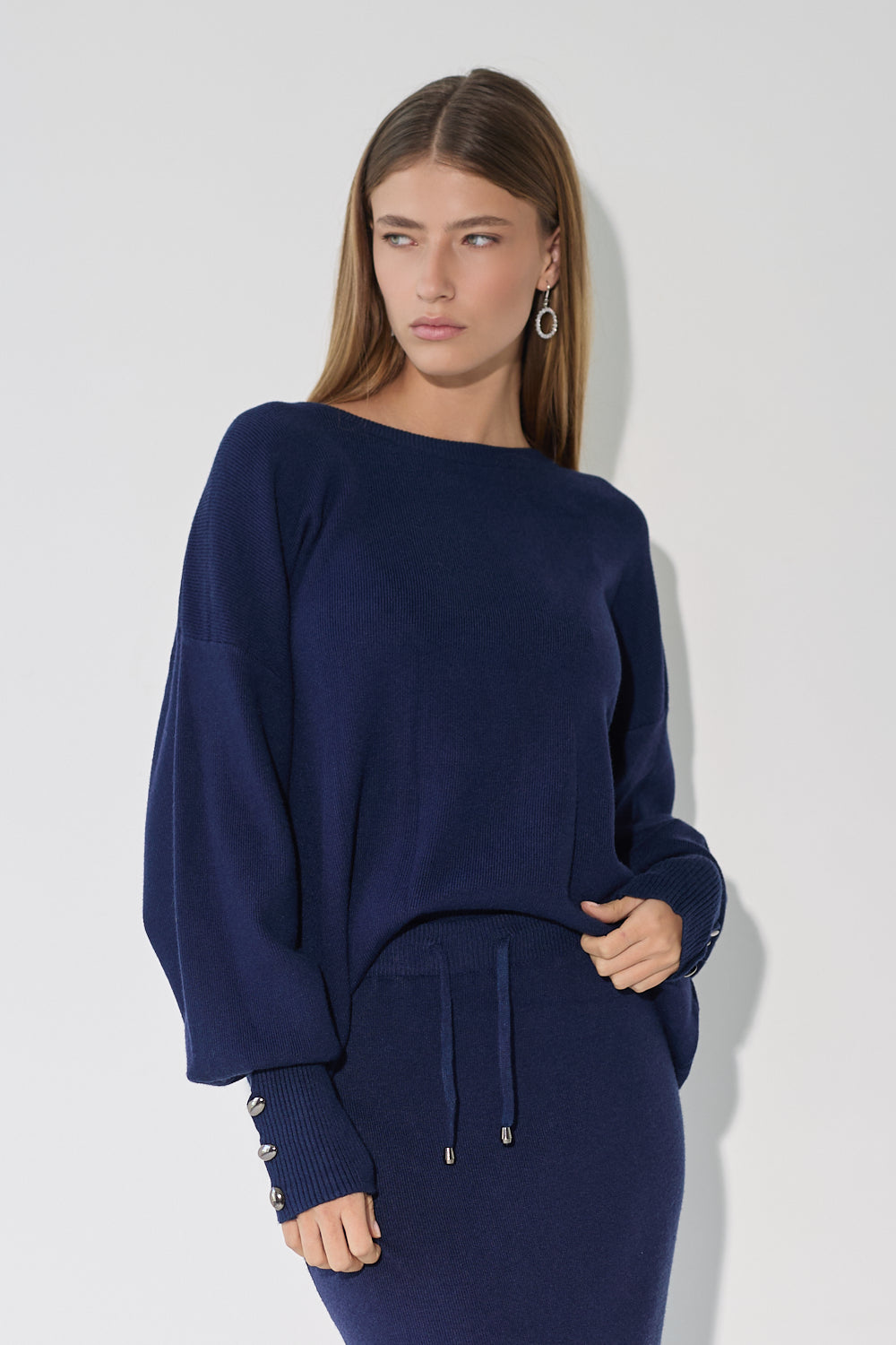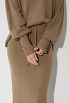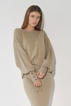 סט סריג תואם הכולל סוודר אוברסייז עם שרוולי ריב מעוטרים בכפתורים כסופים וחצאית שרוך תואמת, עשויים מבד סריג פרמיום ורך במיוחד.